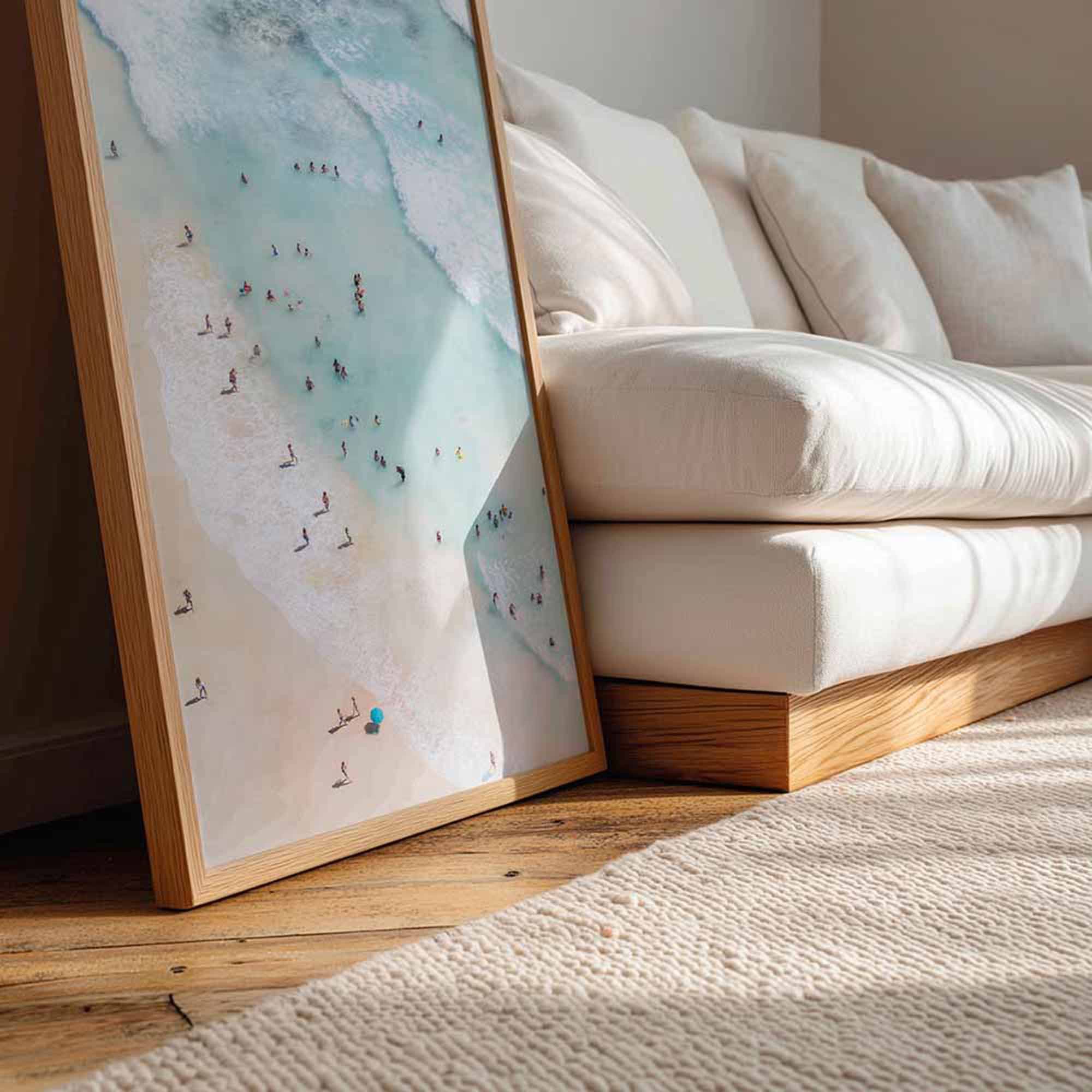 2x3 portrait wood frame on the floor leaning against the wall next to a white couch.