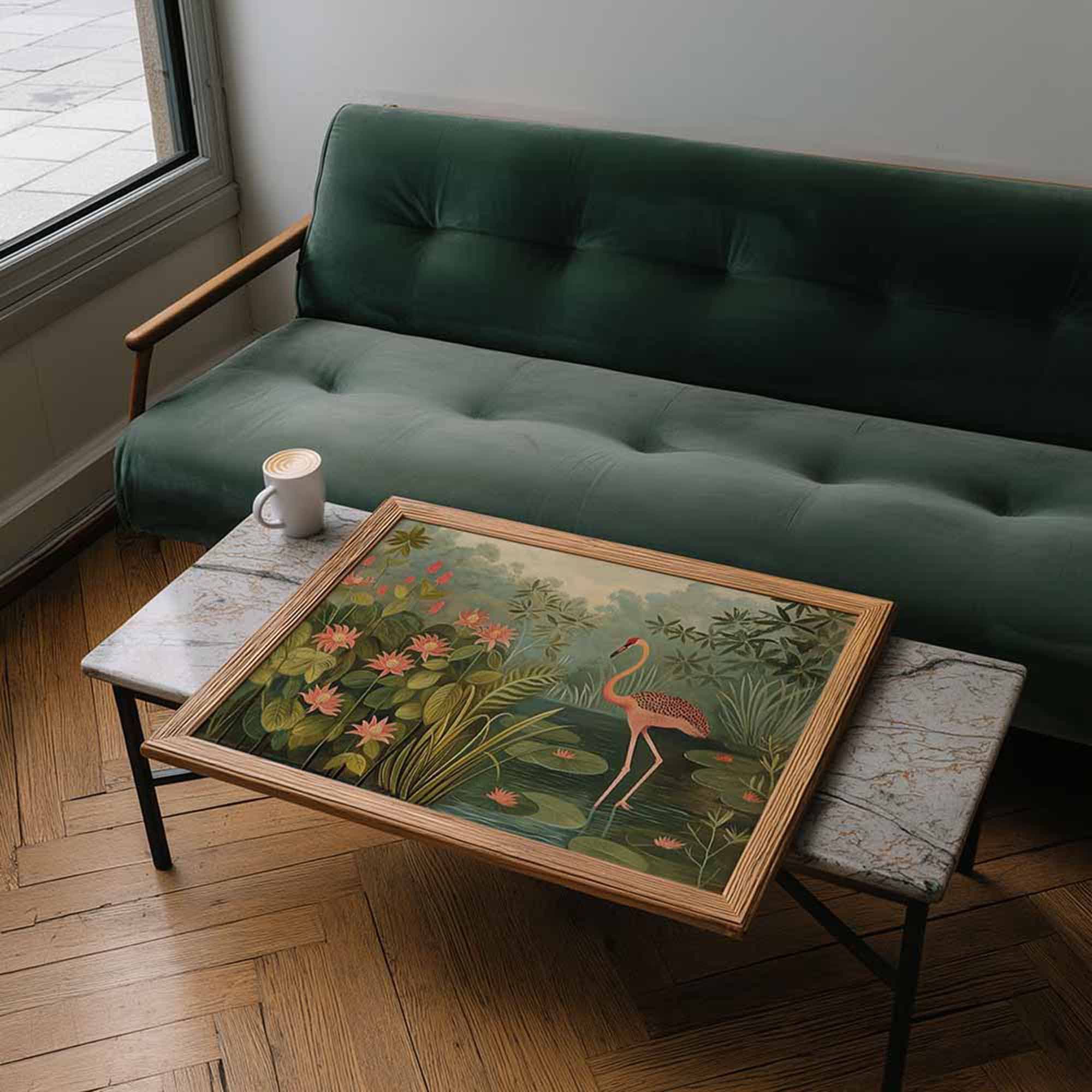 3x4 landscape wood frame on marble coffee table with modern green couch.