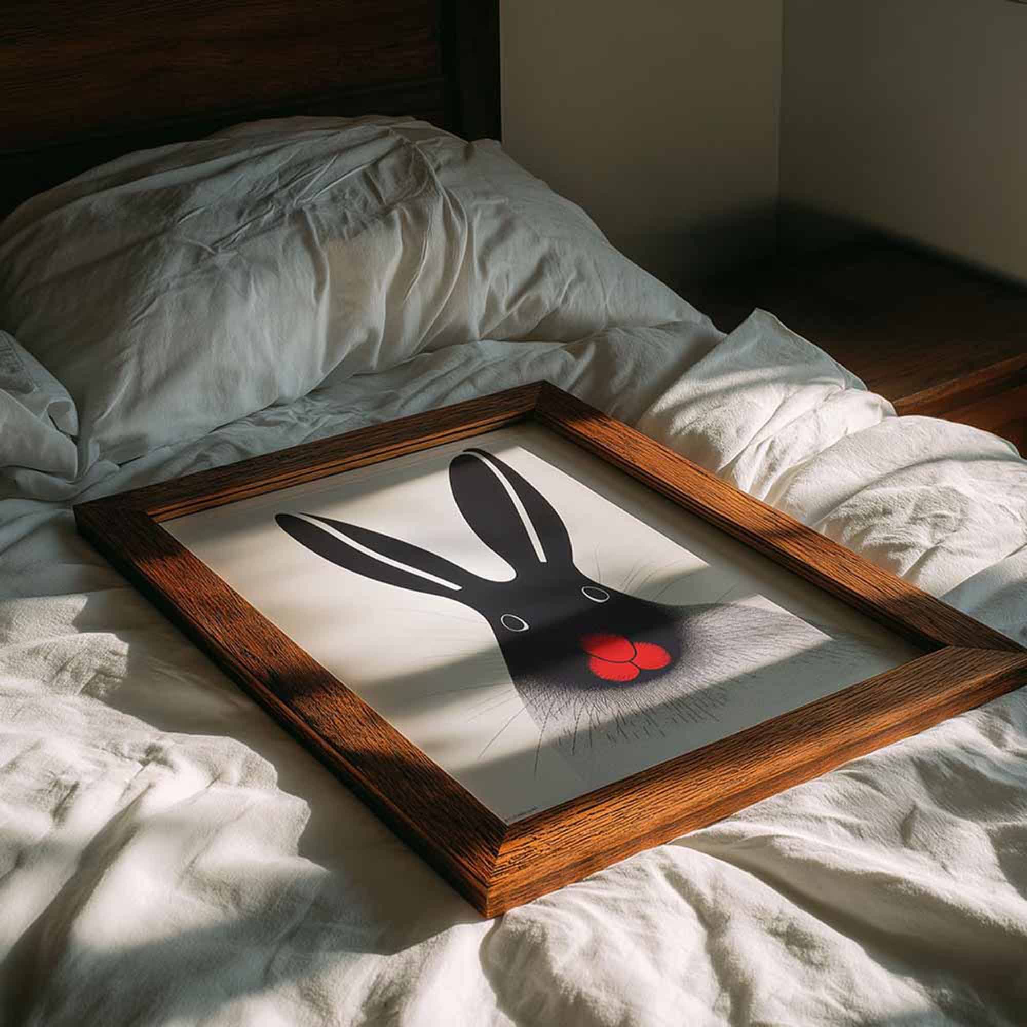 4x5 wood frame leaning on bed with soft lighting.