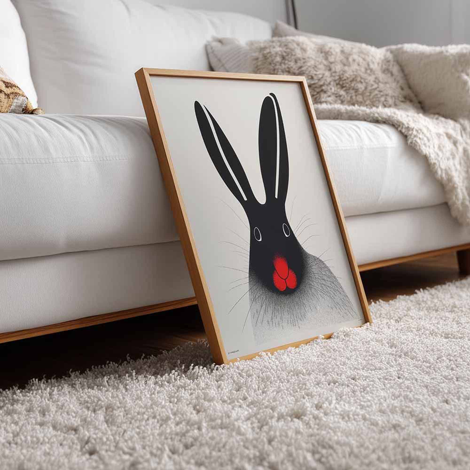 4x5 portrait wood frame on a white high pile rug leaning against a white couch.