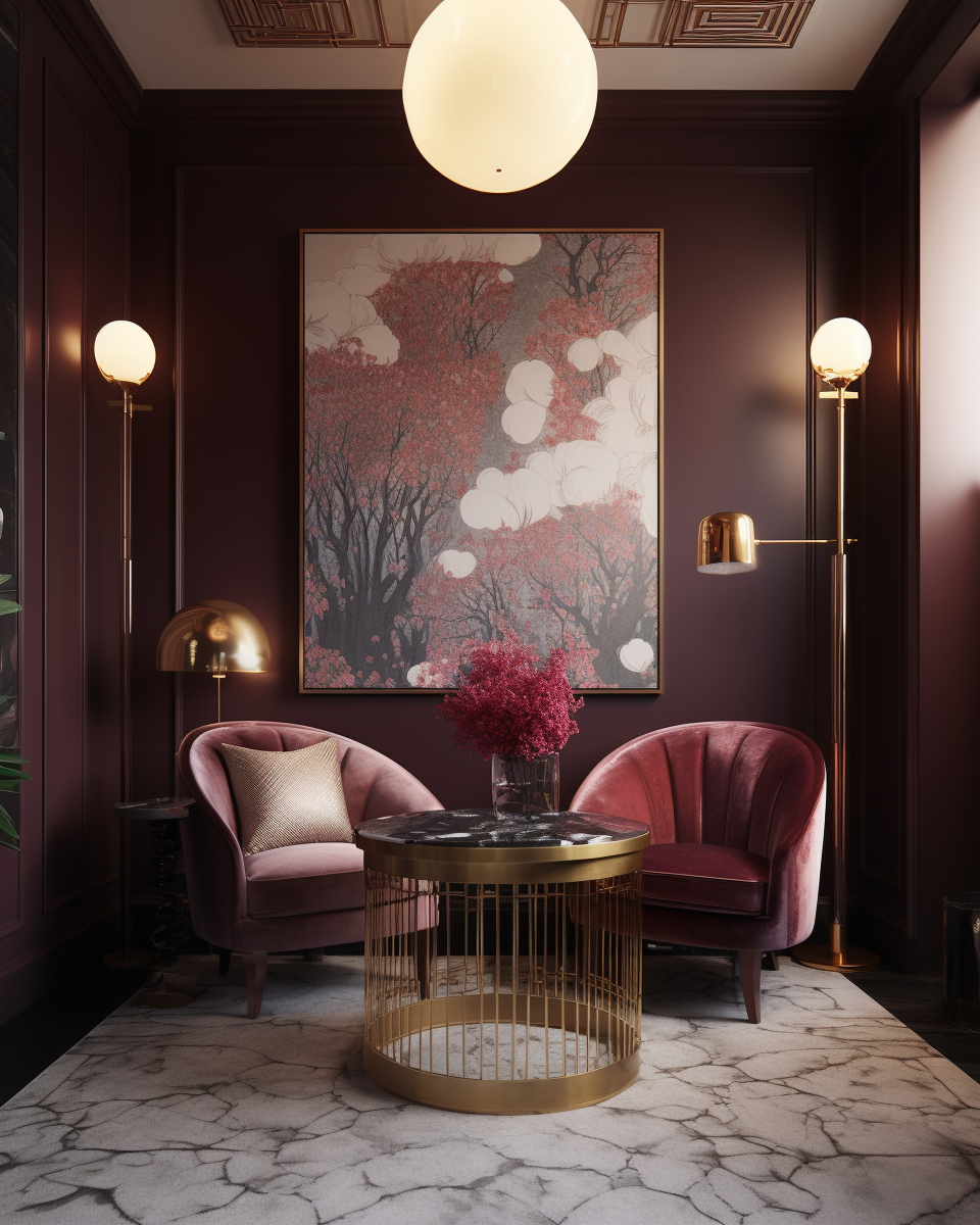 | Features | Symmetrical Layout,Wall Sconces,Globe Pendant Light,Moody Lighting,Dark Paneled Walls,Symmetrical Seating,Marble Floor,Dark Wall Paneling,Moody Ambient Lighting,Brass Accents,Marble Flooring,Floor Lamp Lighting |