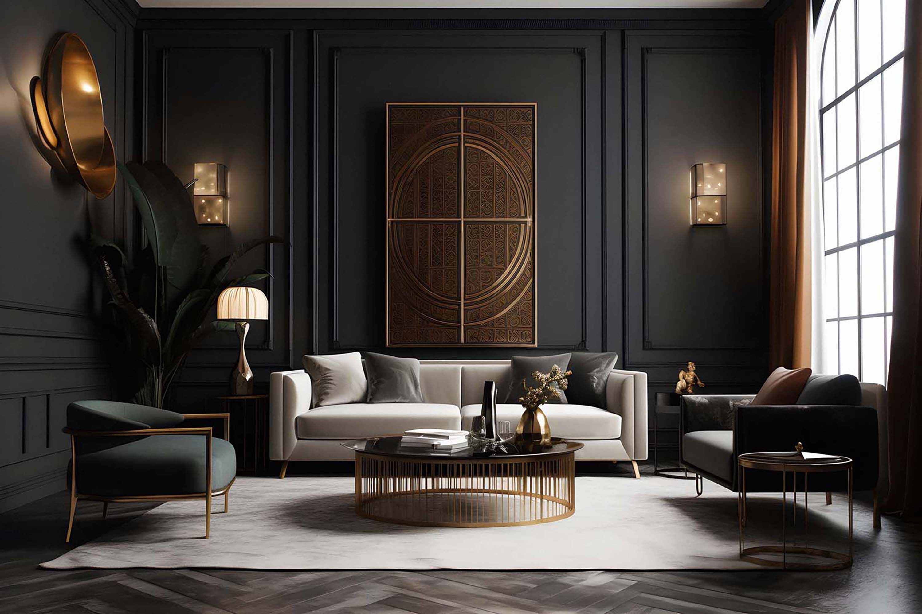 Moody living room with dark panel walls, warm brass sconces, and soft daylight by a tall window.