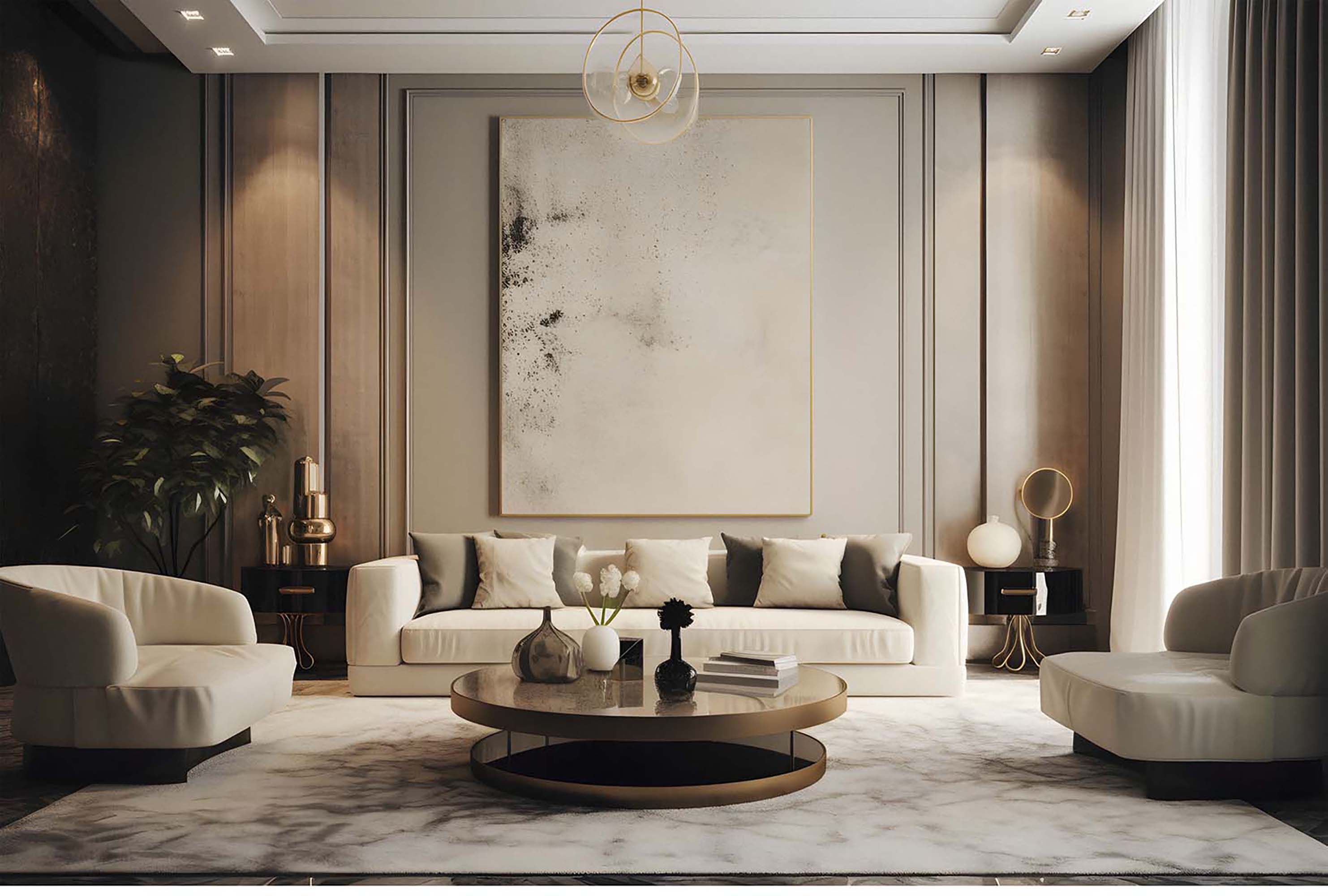 Calm modern living room with paneled walls, soft daylight, and warm metallic accents.