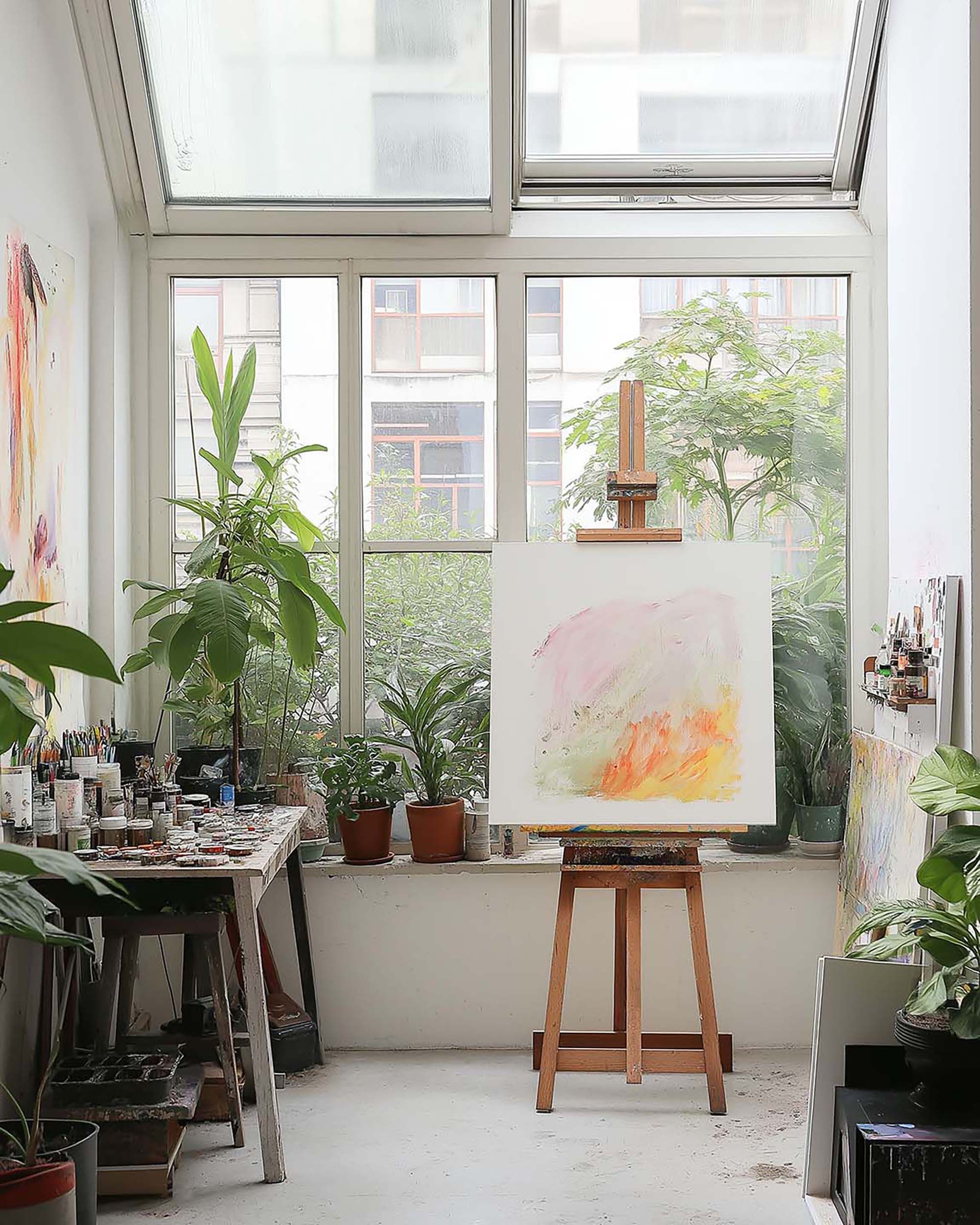 Bright artist studio with tall windows, leafy plants, and a simple easel setup.