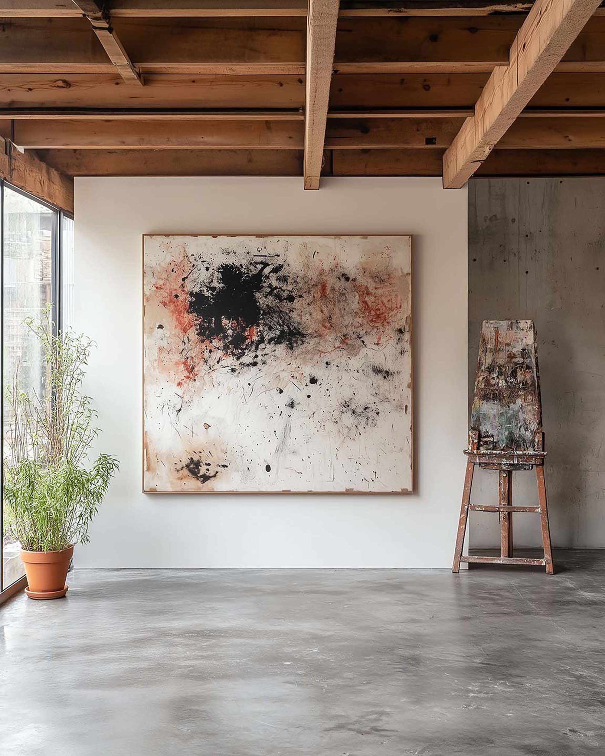 Airy industrial studio with exposed beams, concrete floors, and a large wall frame.