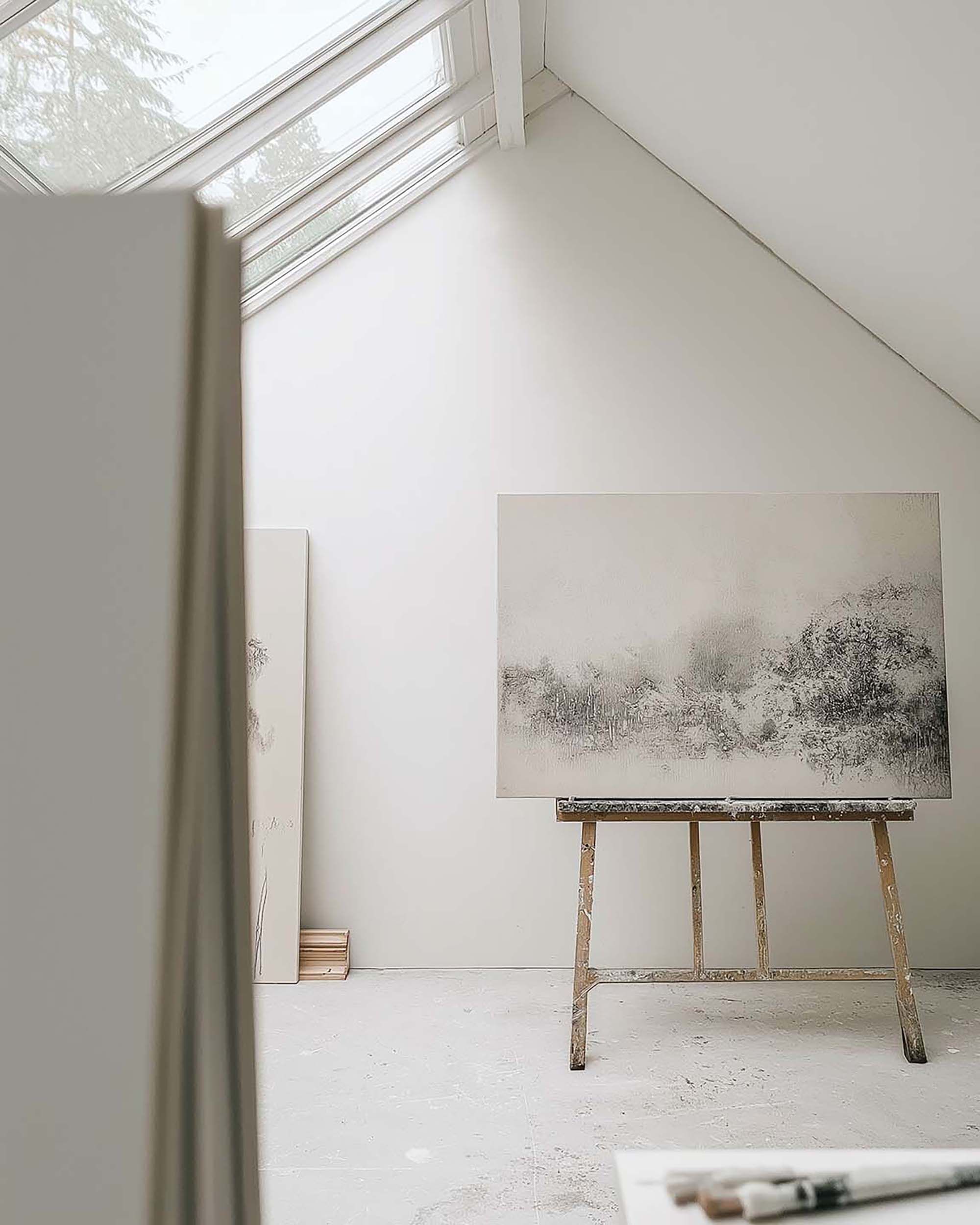 Quiet studio corner with soft skylight daylight and a simple easel setup.