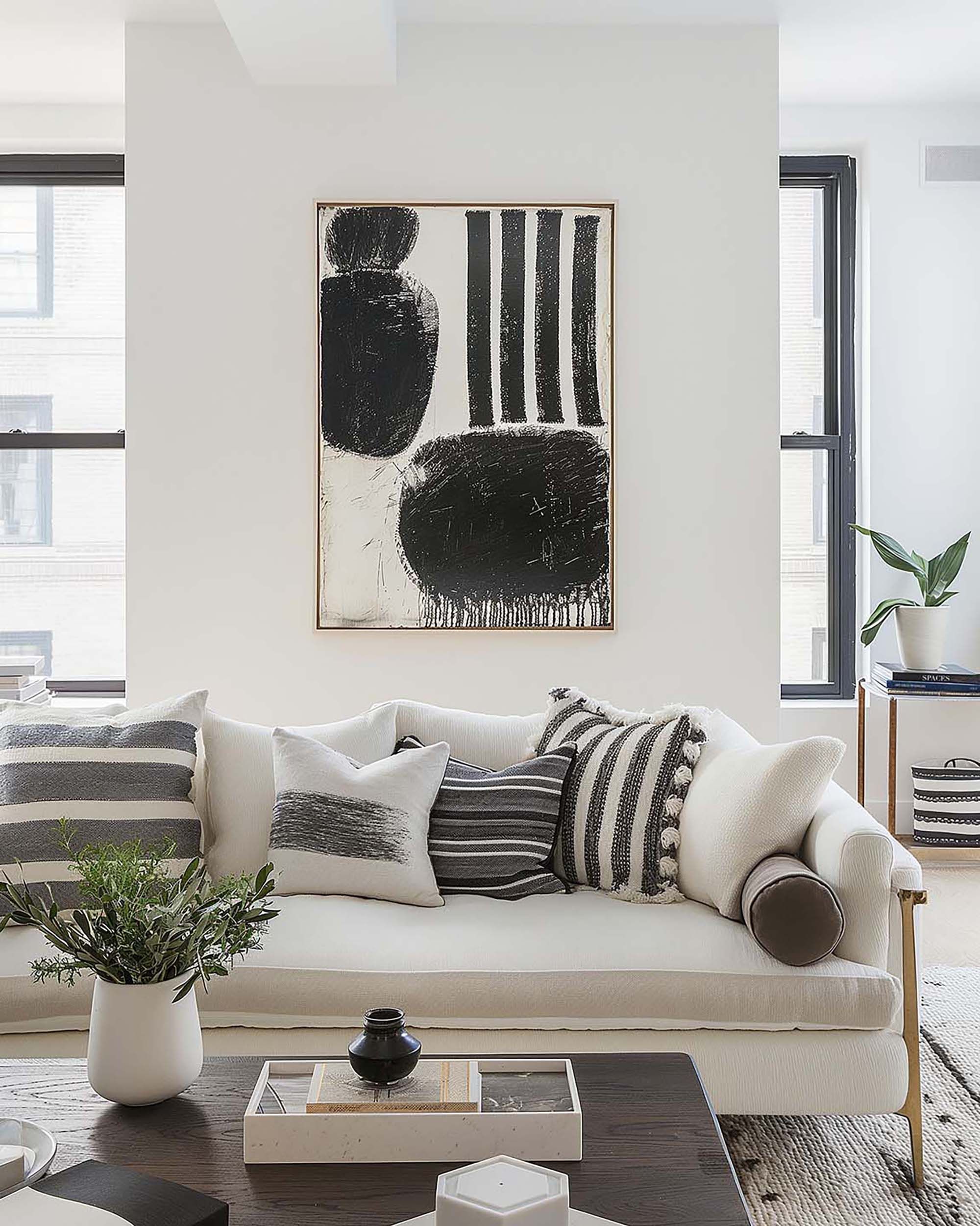 Airy modern living room with soft daylight, a white sofa, and a large frame over the seating.
