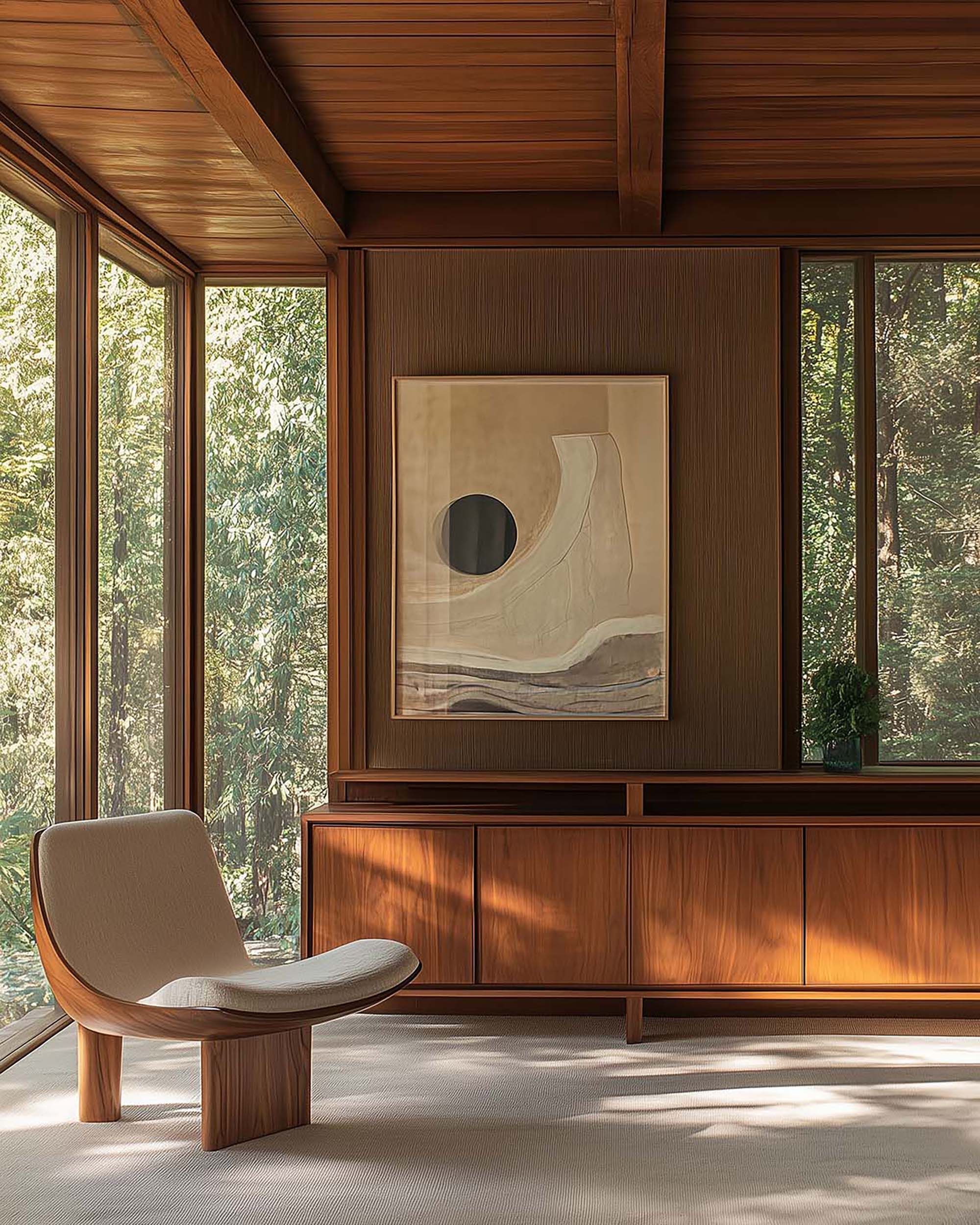 Sunlit wood-paneled living room with low cabinetry and a calm, modern feel.