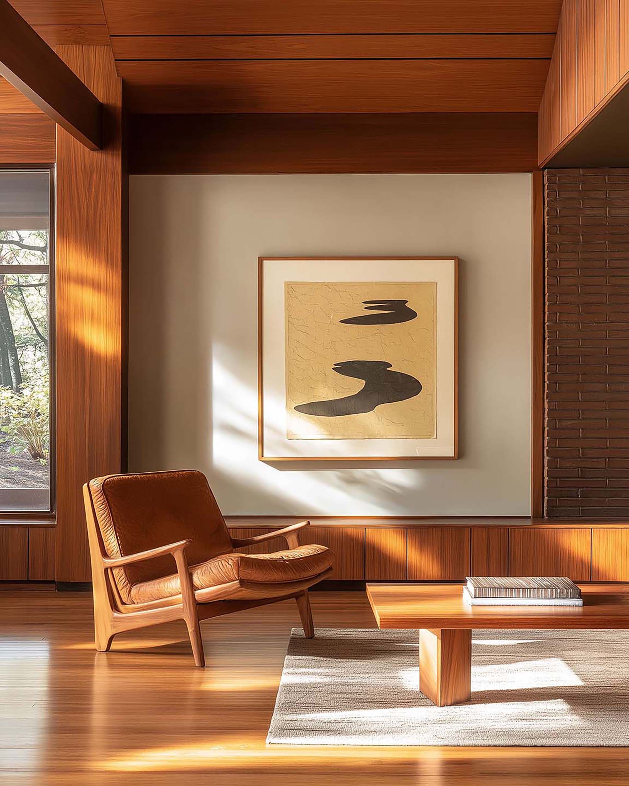 Sunlit mid-century living room with warm wood paneling and a low lounge chair.