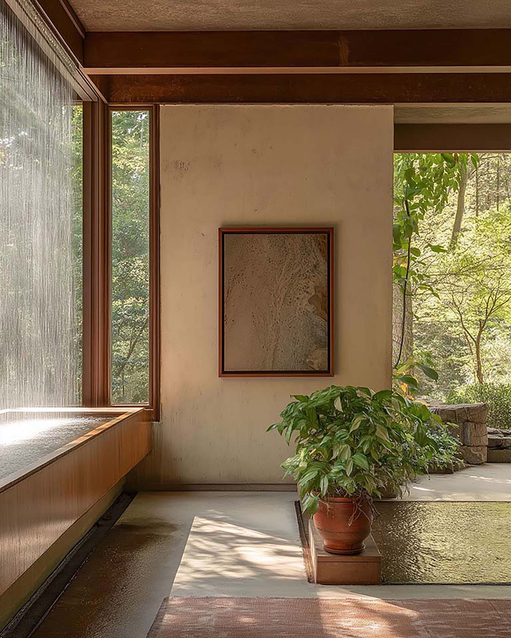 The room is a mid-century modern style courtyard with water fountain and pond that opens to a forest.