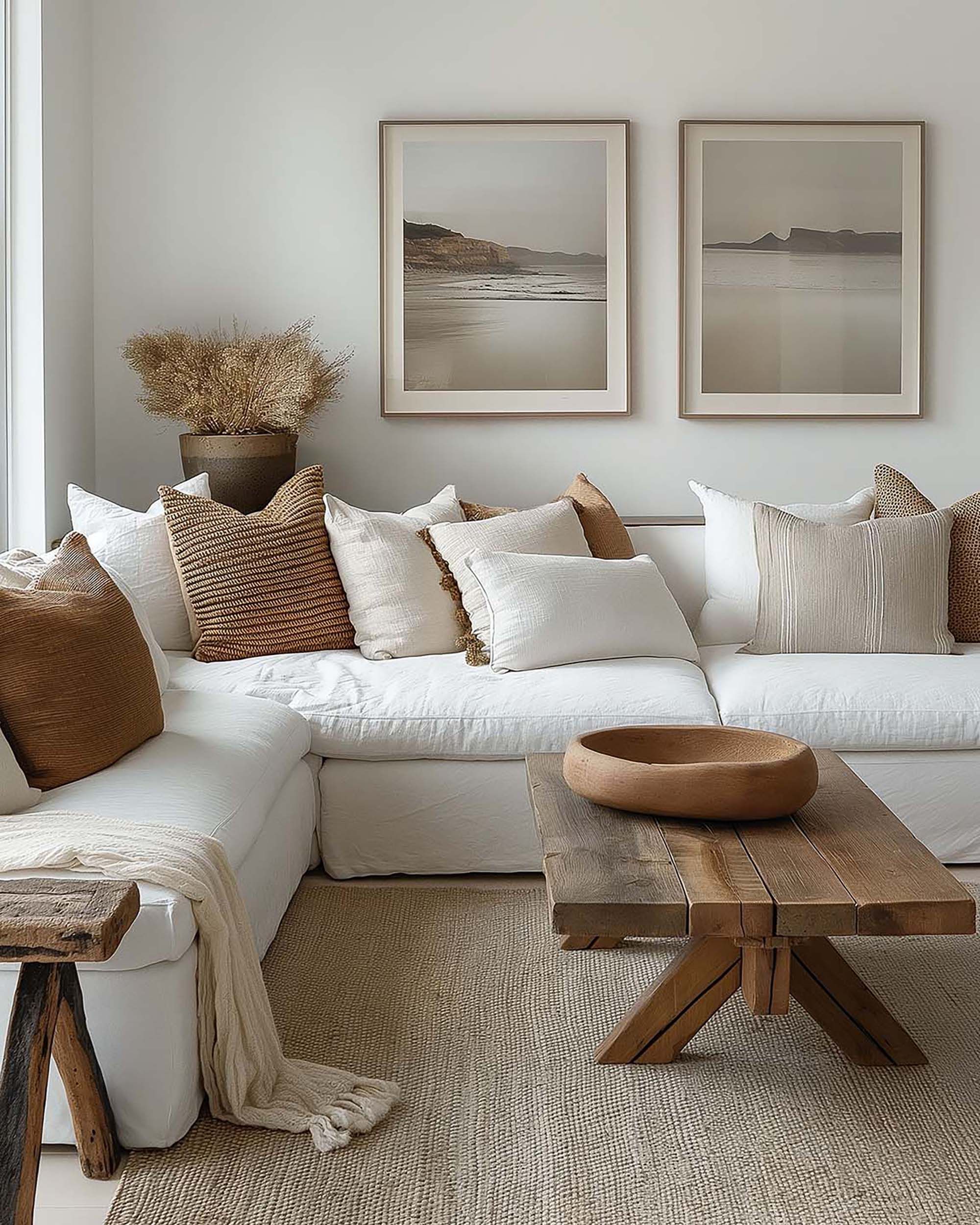 | Features | Soft Natural Light,White Wall,Neutral Textiles,Rustic Wood Accents,Gallery Wall Layout,Woven Floor Rug,Cozy Styling |