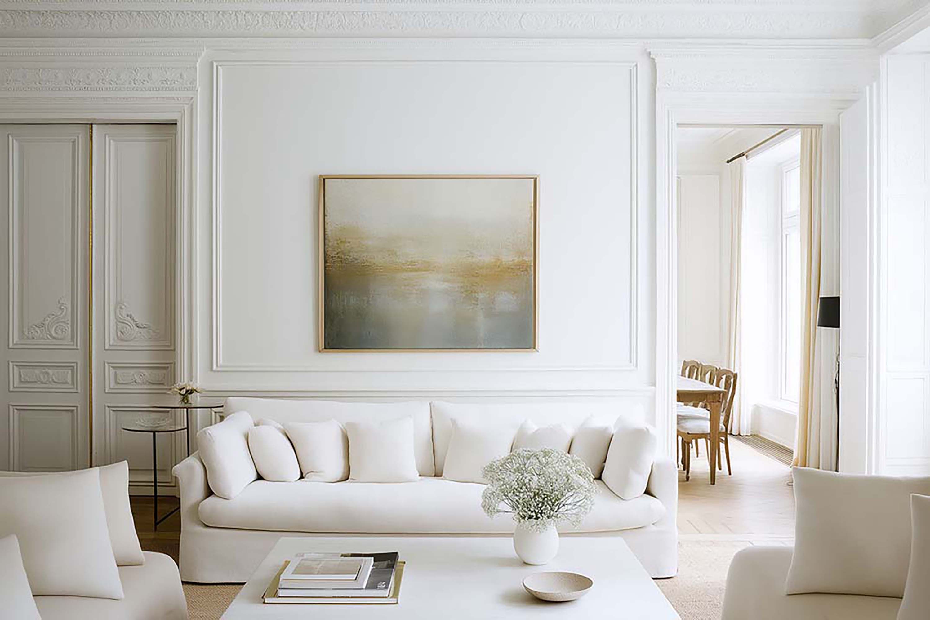 Airy classic living room with ornate molding, a white sofa, and soft window light.
