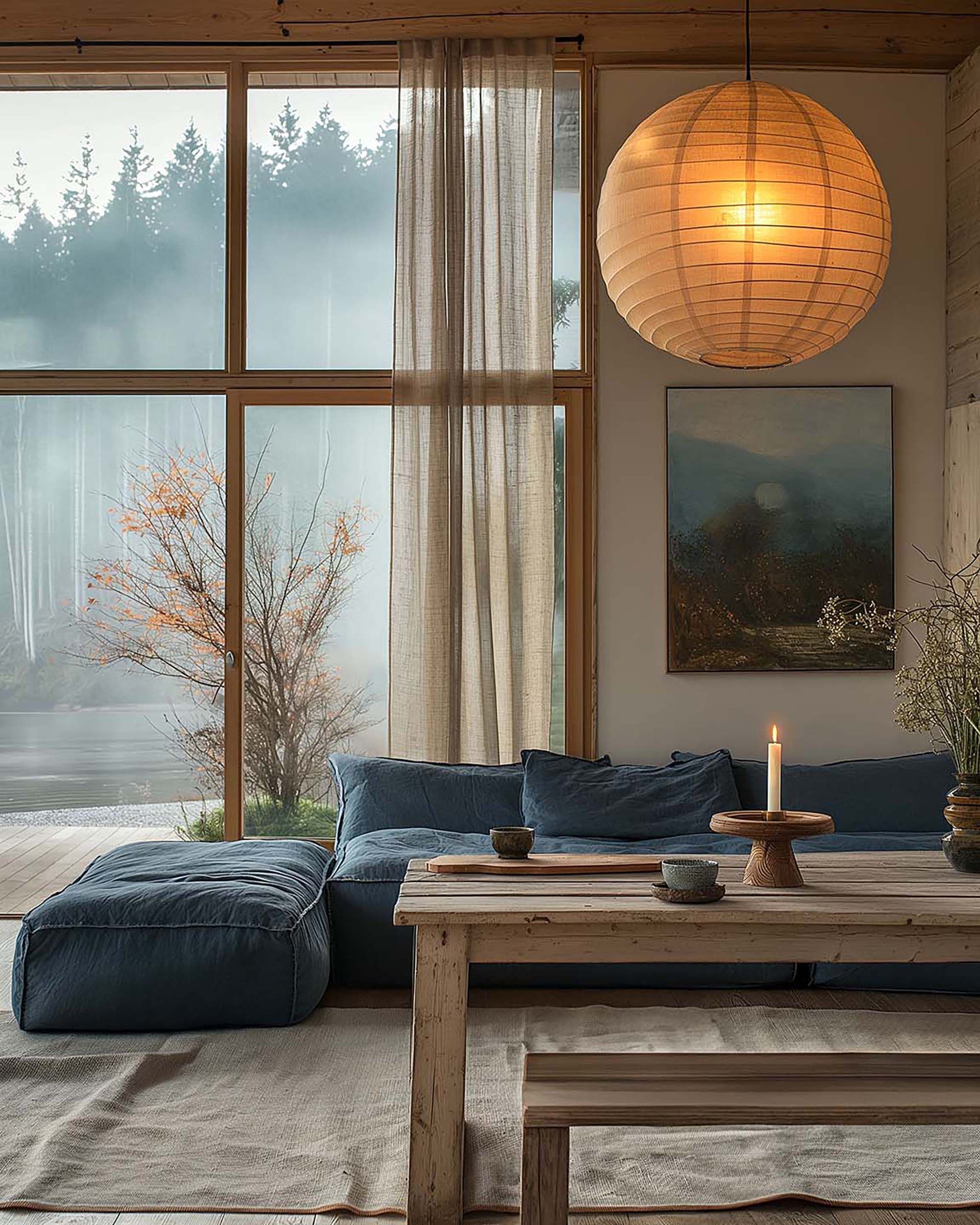 Calm living room corner with floor-to-ceiling windows, sheer curtains, and a warm paper lantern glow.