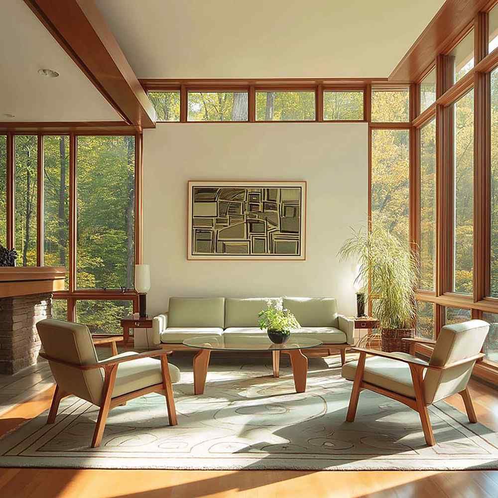 Sunlit mid-century living room with warm wood trim and expansive windows facing trees.