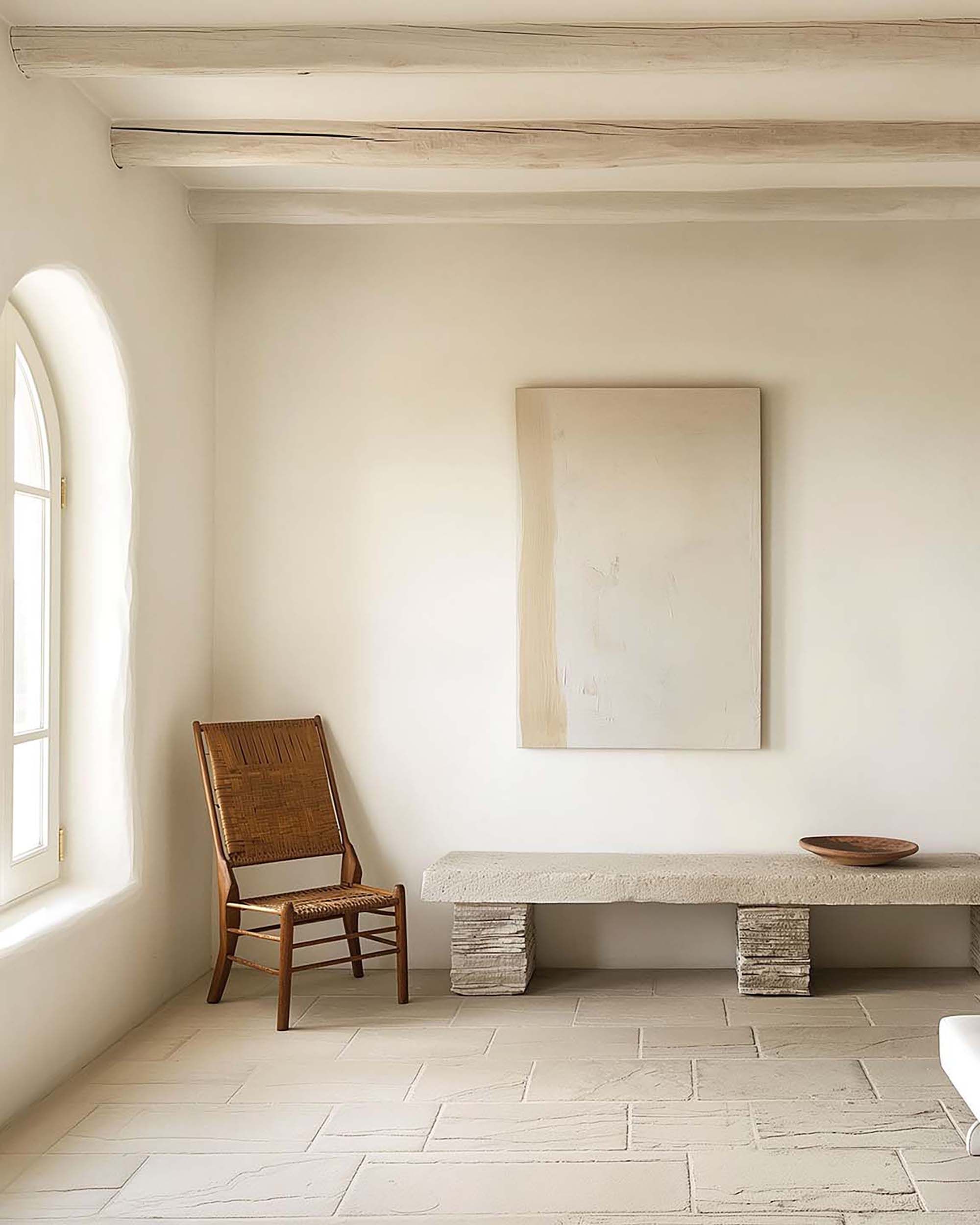 | Features | Neutral Palette,Textured Plaster Wall,Stone Tile Floor,Soft Natural Light,Wall-mounted Frame,Exposed Ceiling Beam,Arched Window |