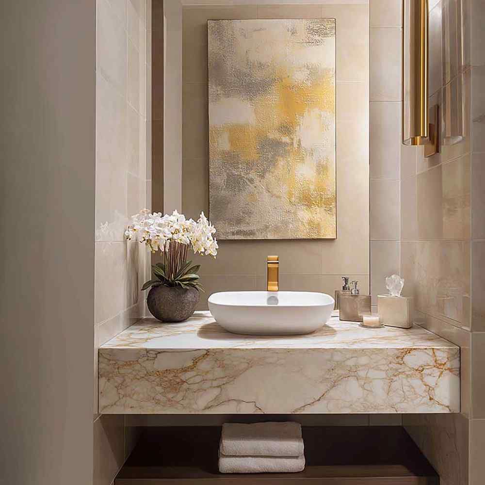 Warm modern bathroom vanity with a marble counter, vessel sink, and soft brass accents.