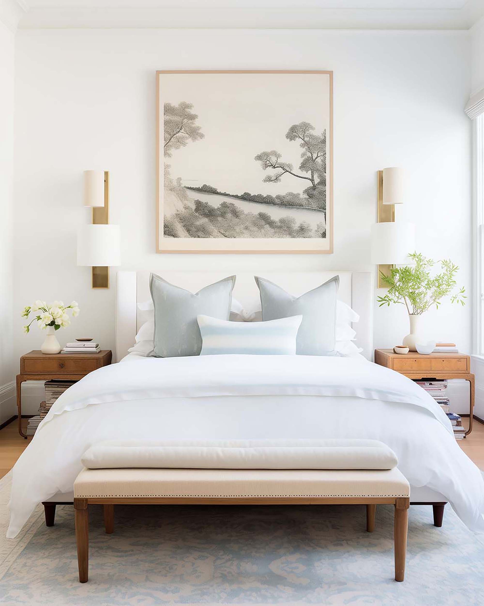 Airy bedroom scene with crisp white bedding, brass sconces, and a centered wall frame.
