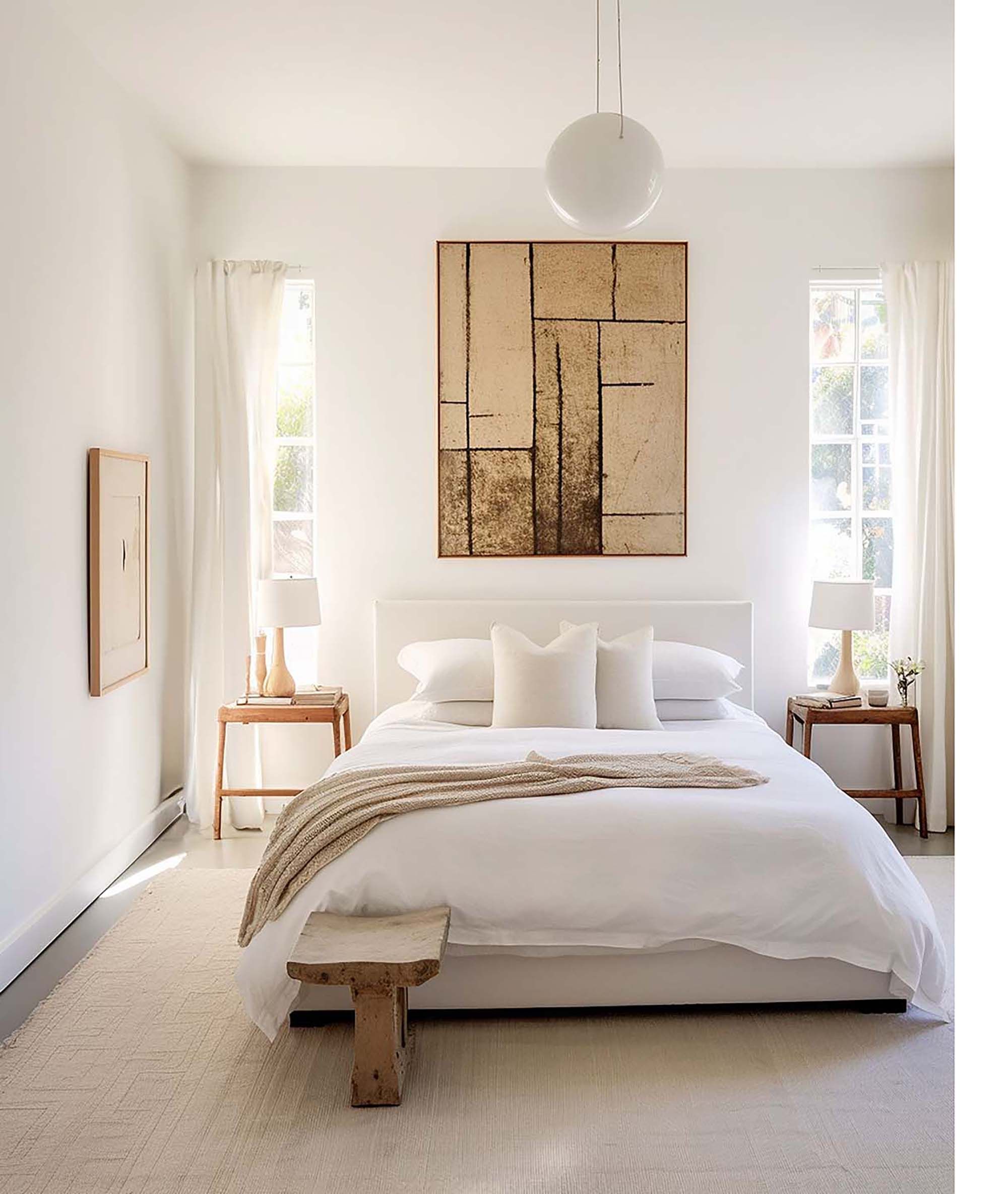 Airy minimalist bedroom with tall windows, white bedding, and warm wood accents.