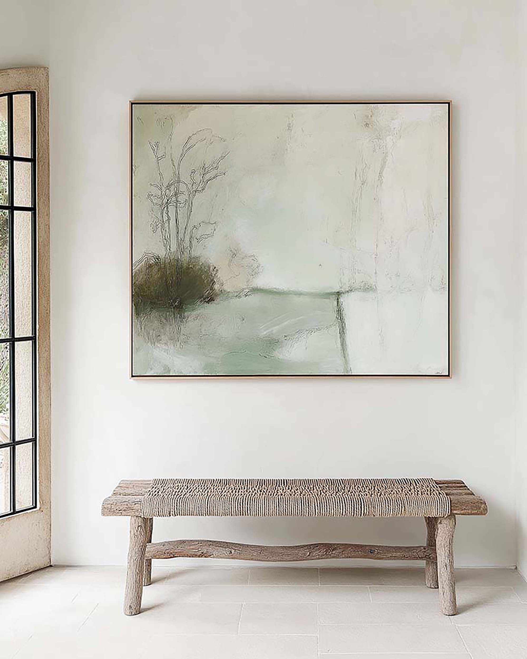| Features | High Wall Space,Simple Wall Layout,Tile Floor,Large Wall-mounted Frame,White Plaster Wall,Soft Natural Light,Black Grid Window |