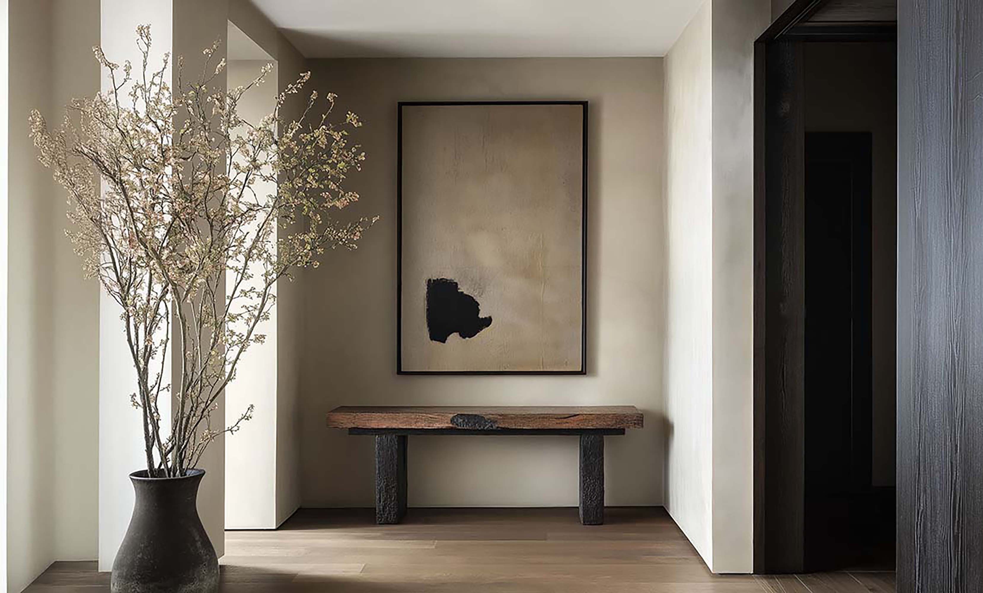 Quiet minimalist entryway with soft daylight, warm wood floors, and a rustic bench in a wall niche.