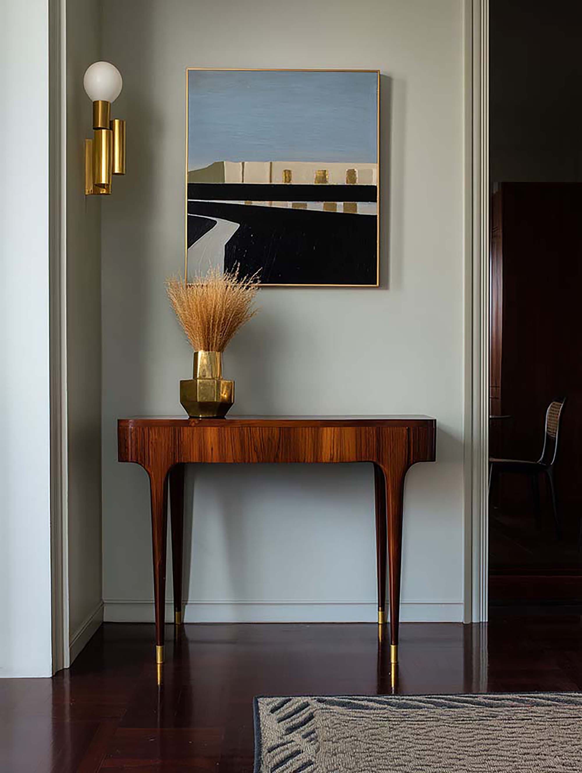 Mid-century inspired entryway with a warm wood console and brass sconce.