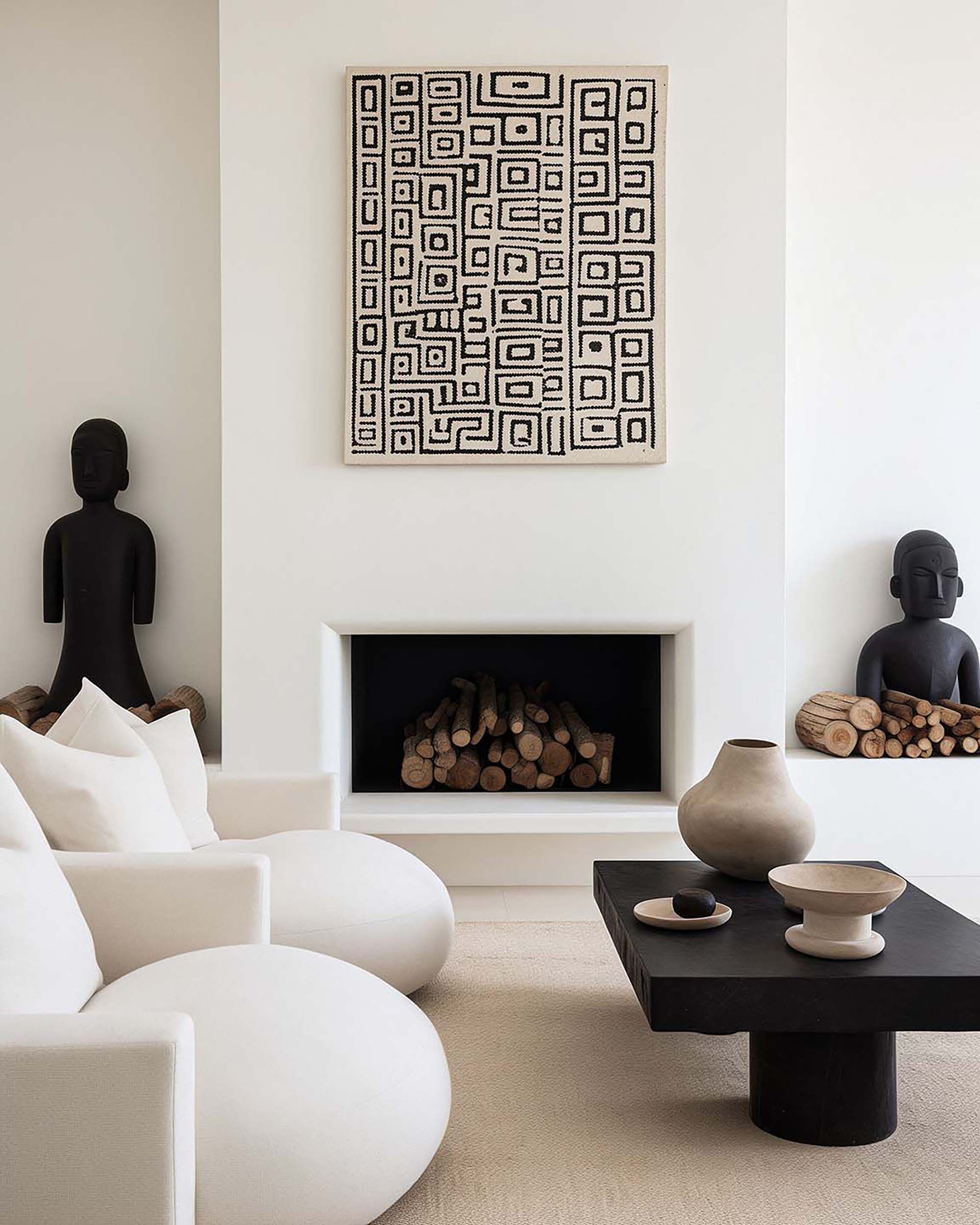 Calm minimalist living room with a recessed fireplace and sculptural black coffee table.