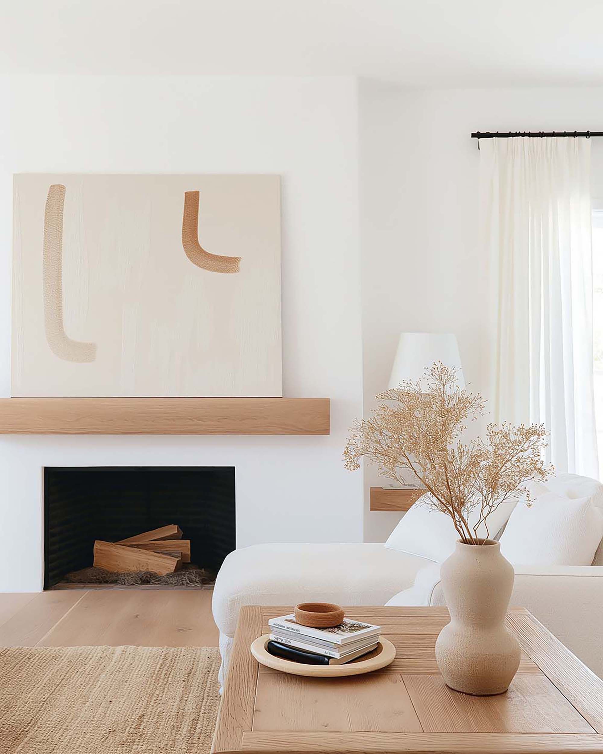 Airy living room with a wood mantel and soft daylight for a calm, minimalist feel.