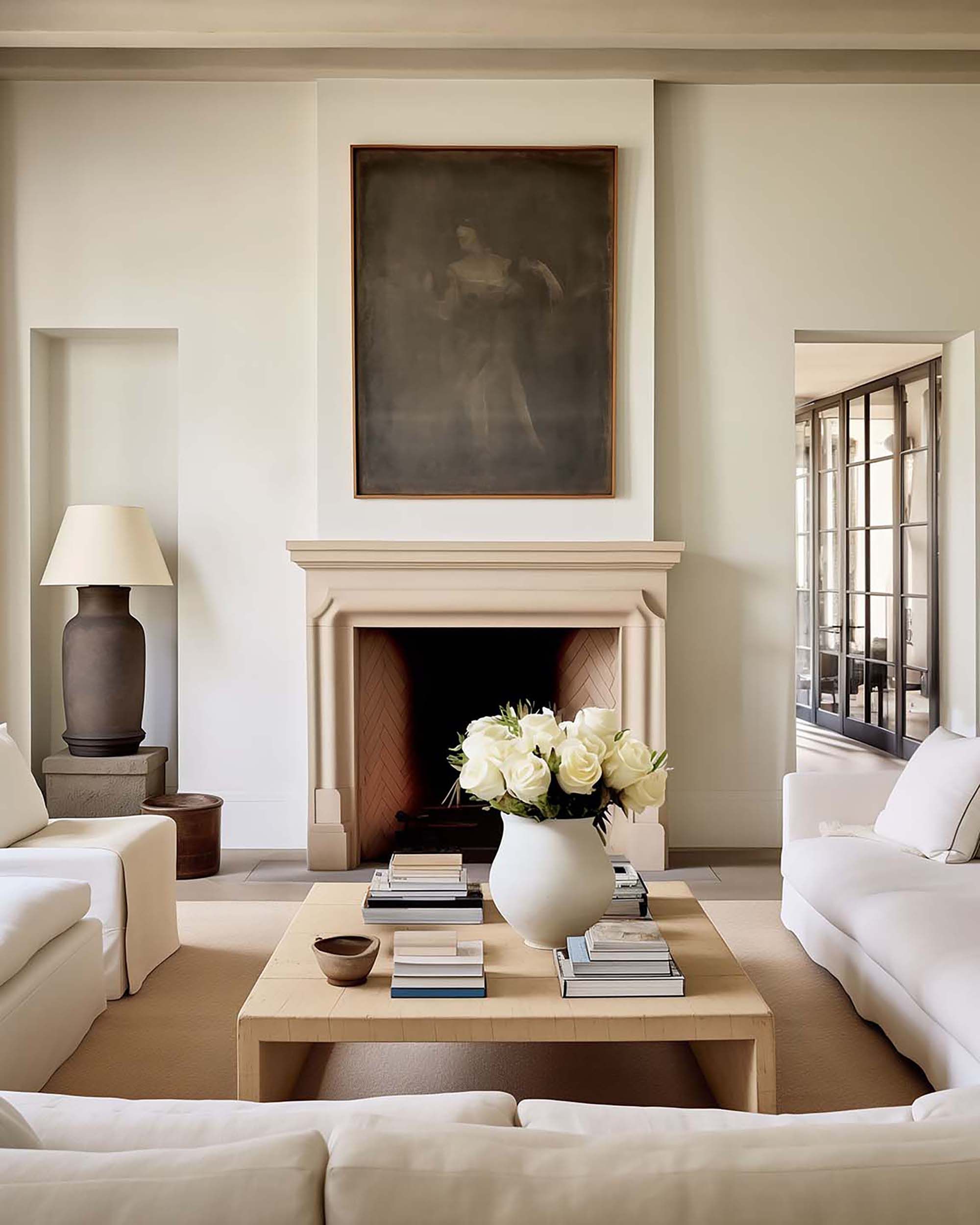 Calm neutral living room with a fireplace mantel and clean-lined seating.