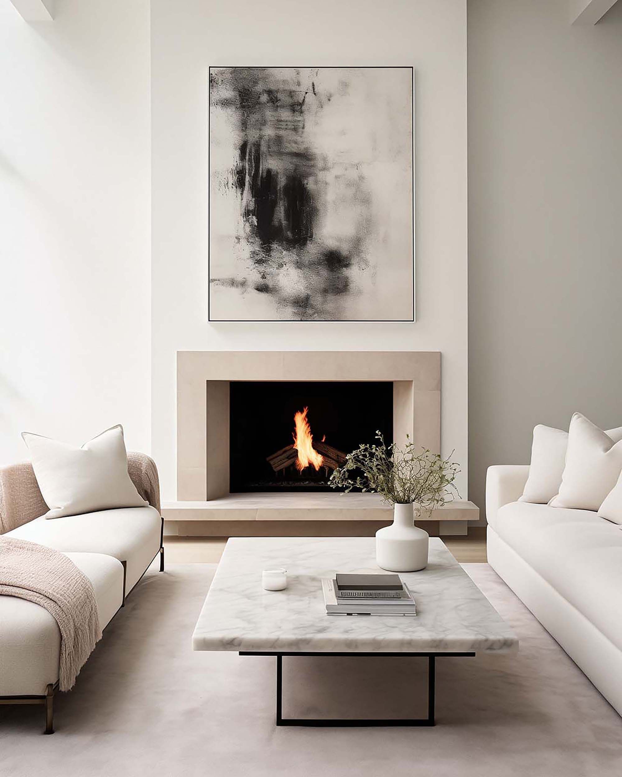 Calm minimalist living room with a stone fireplace and clean wall space above the mantel.