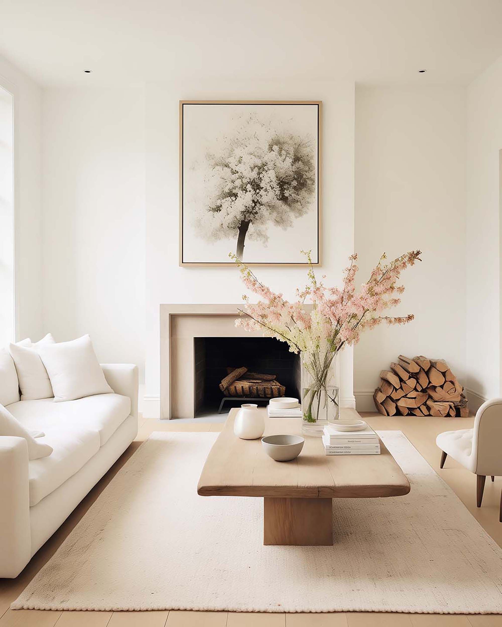 Calm minimalist living room with a clean fireplace wall and warm wood coffee table.