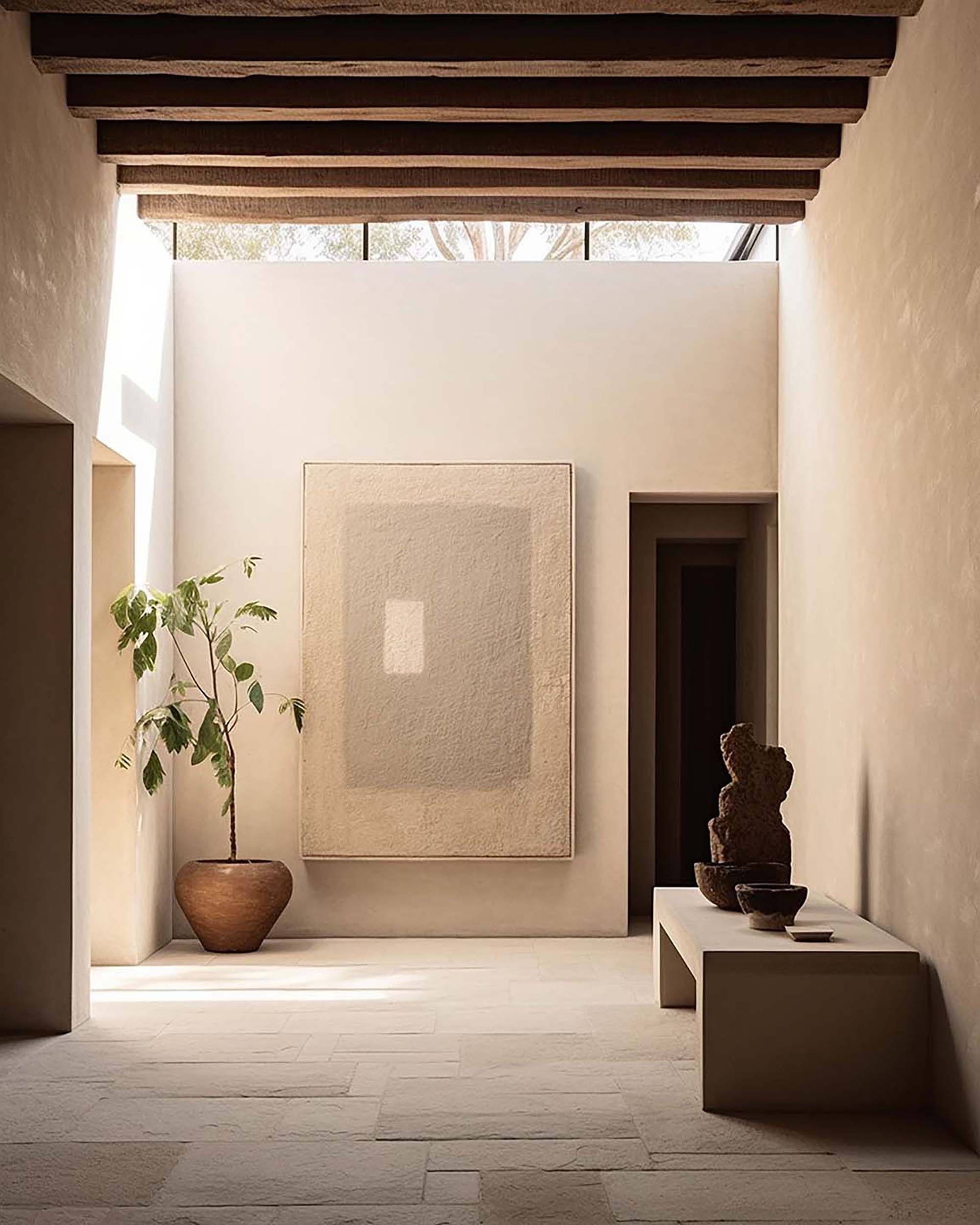 Quiet minimalist hallway with plaster walls, wood beams, and soft daylight.