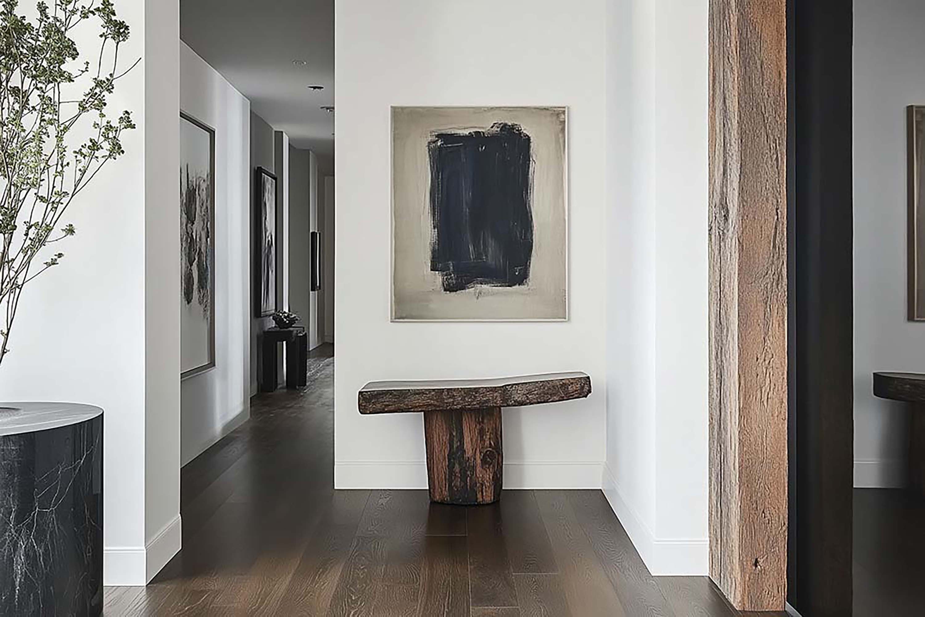 Modern hallway with white walls, dark wood flooring, and a rustic wood console.