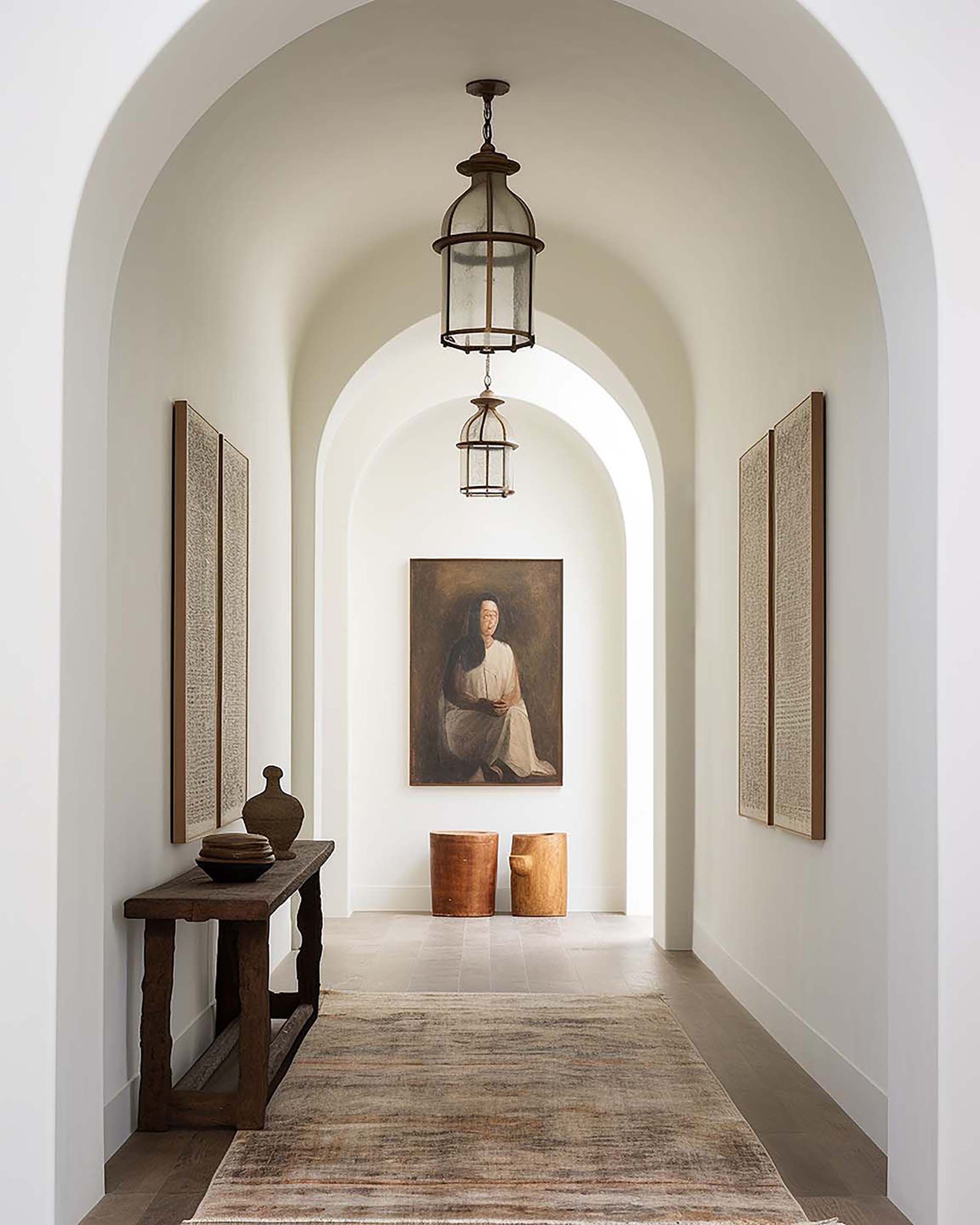 Quiet arched hallway with lantern pendants, warm wood accents, and a soft neutral runner.