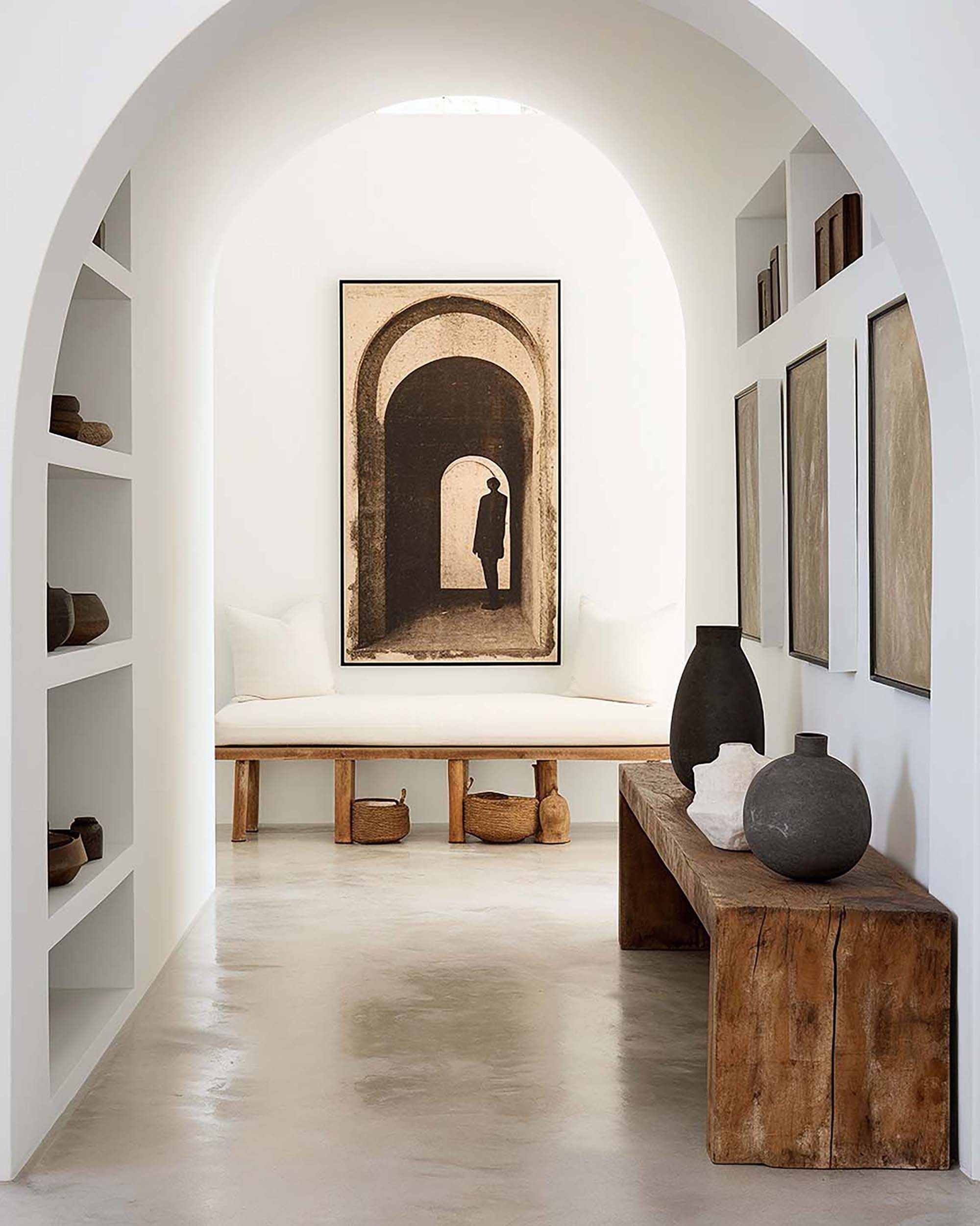 Bright arched hallway with built-in niches, warm wood accents, and a calm gallery wall.