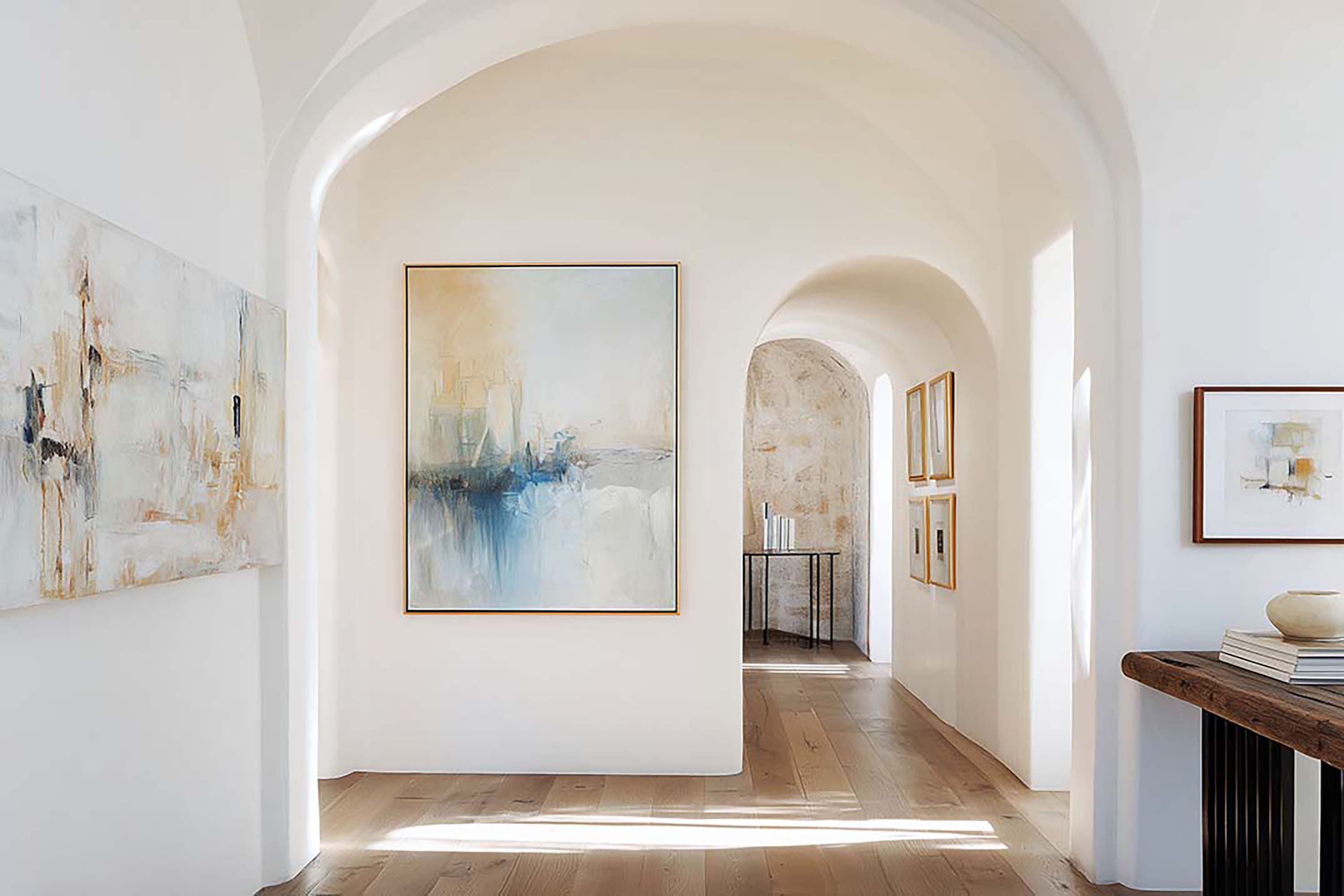 Sunlit arched hallway with white plaster walls and warm wood floors.
