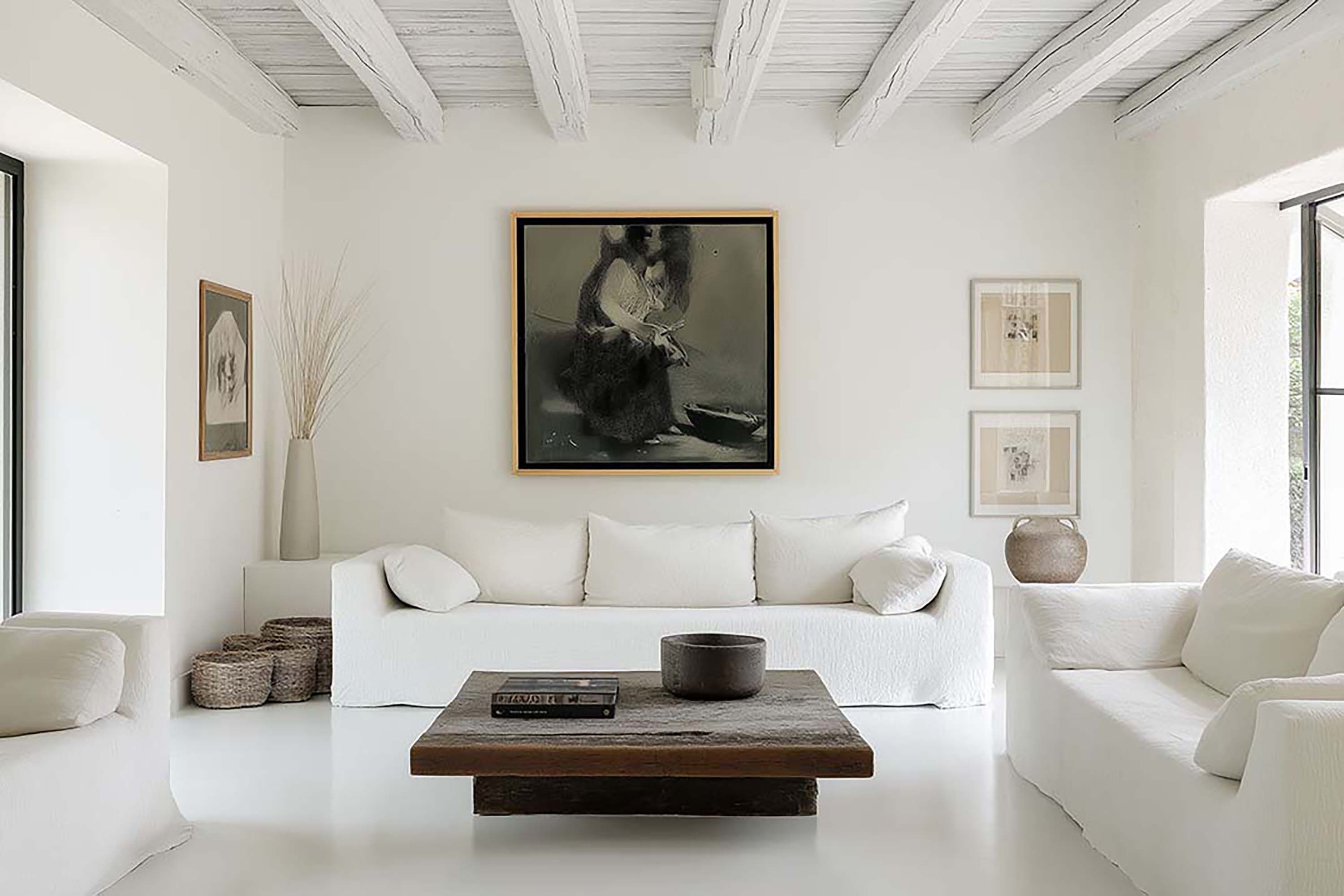Airy minimalist living room with whitewashed beams and a low wood coffee table.