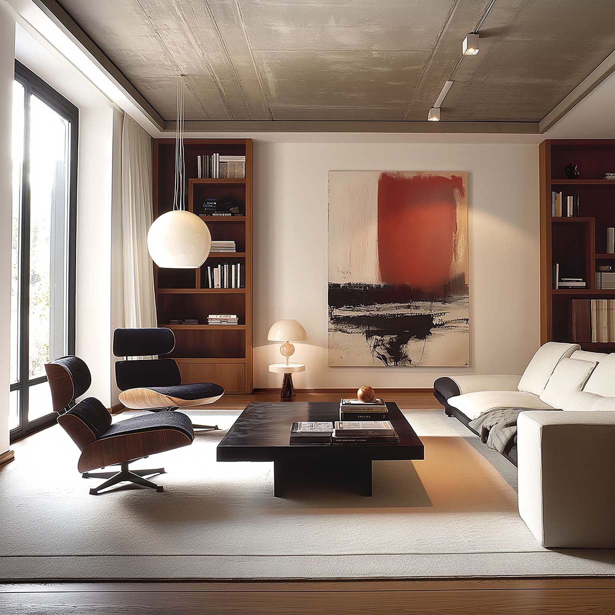 | Features | Built-in Shelving,Track Lighting,Open Floor Plan,Soft Daylight,Floor-to-ceiling Window,Sheer Curtains,Large Wall Frame,Neutral Rug |