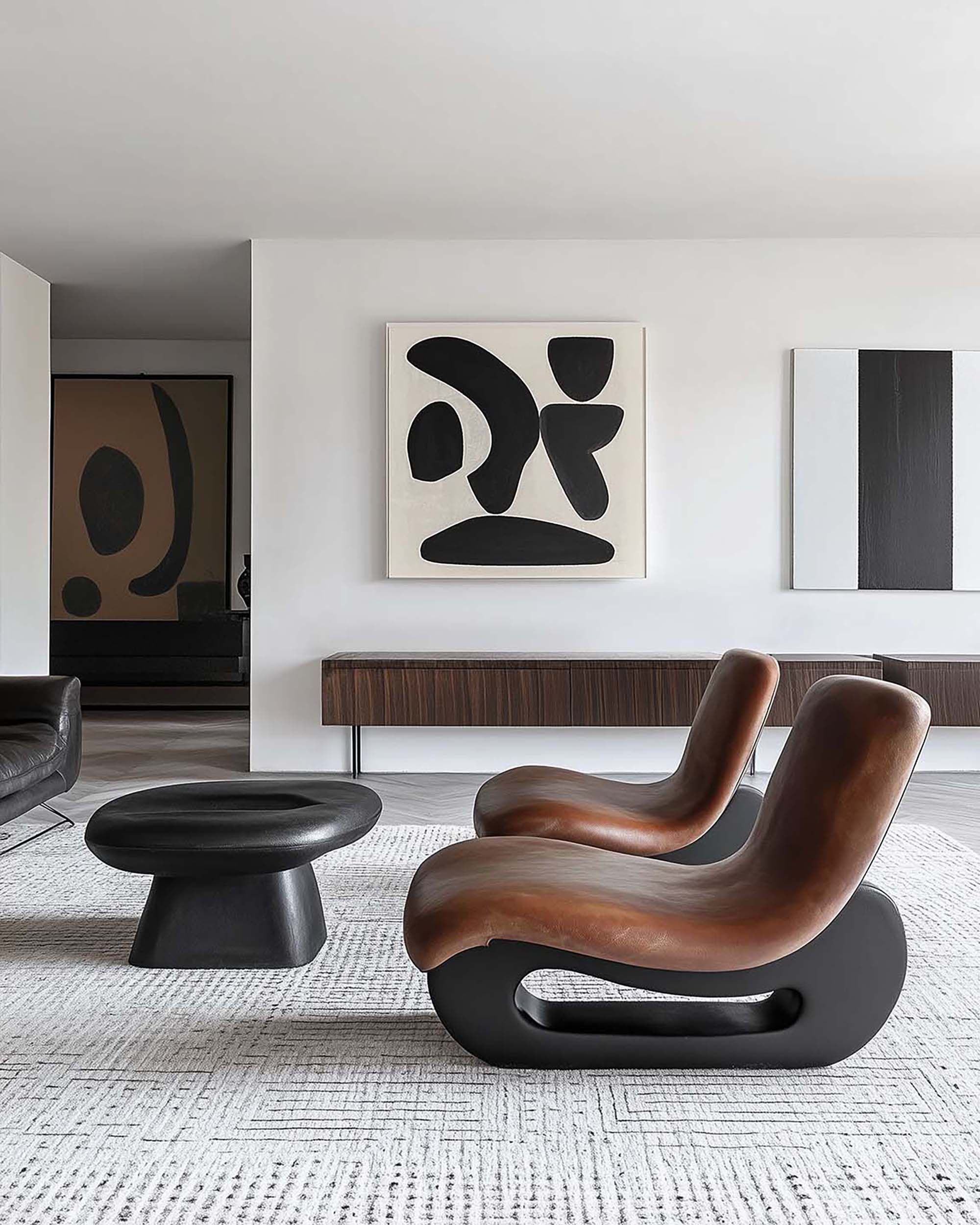Contemporary living room with a crisp white wall, floating credenza, and sculptural seating.