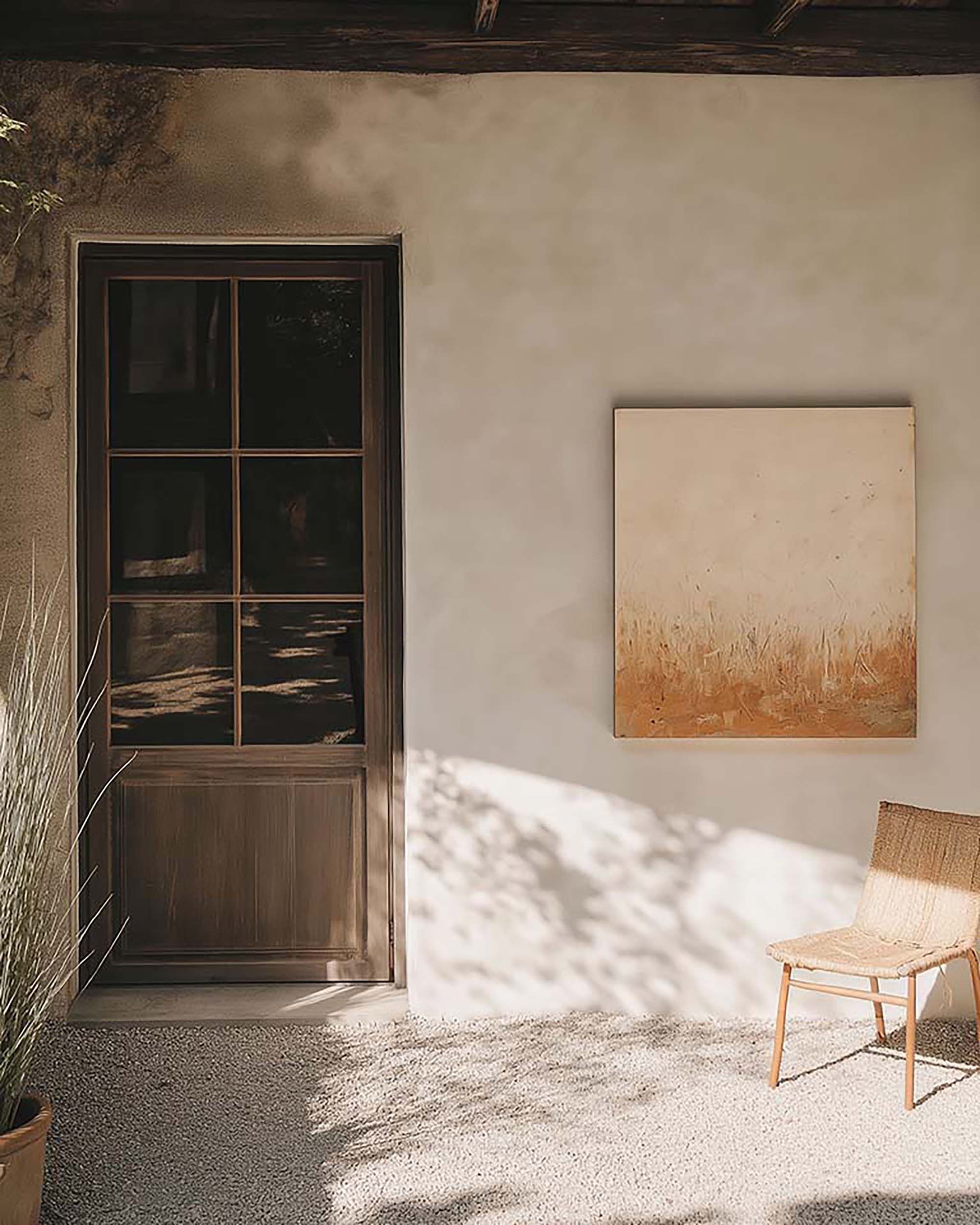 Outdoor entrance with a plaster wall, soft window light, and a woven chair.