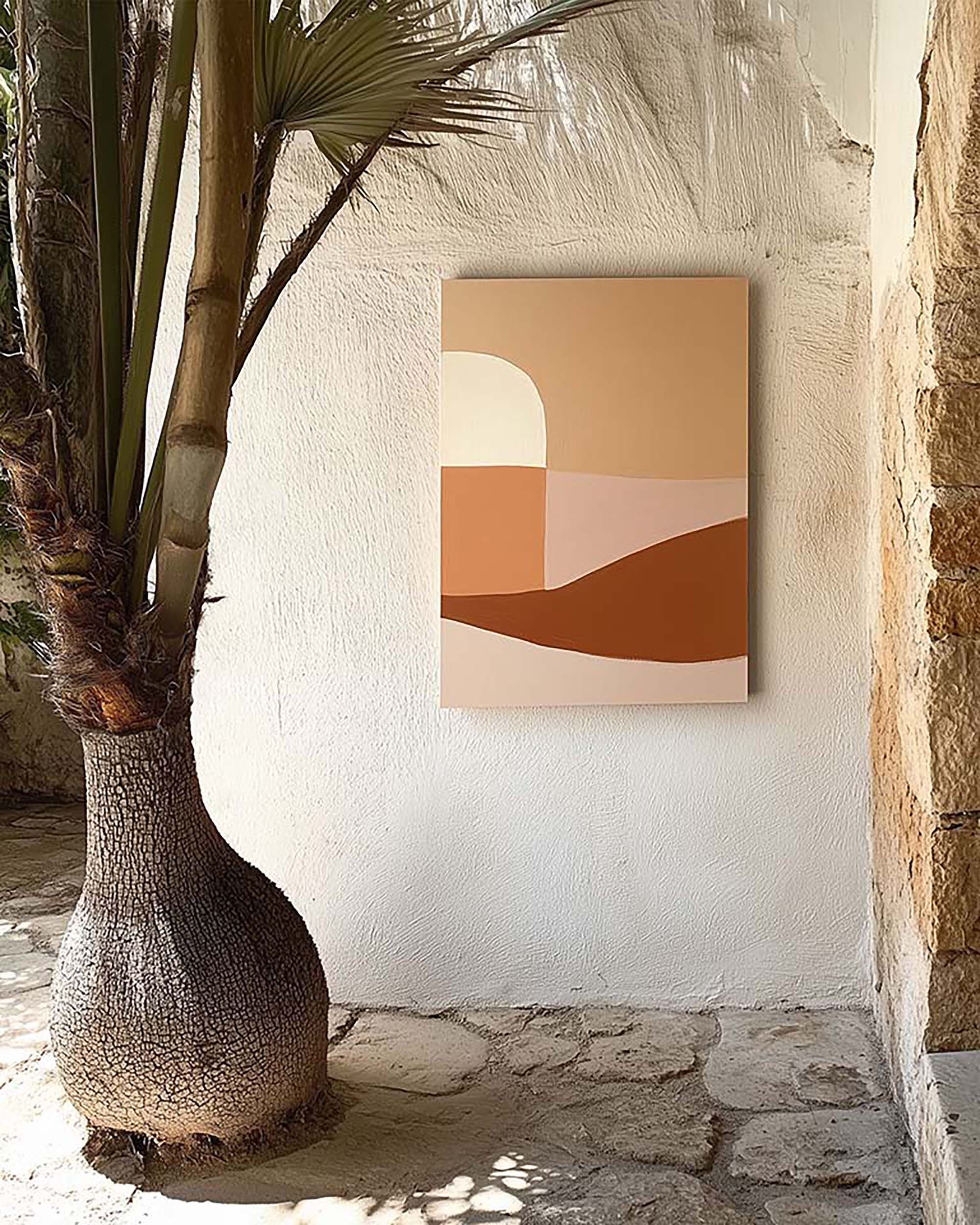Sunlit stone patio corner with a textured white plaster wall and a large potted palm.