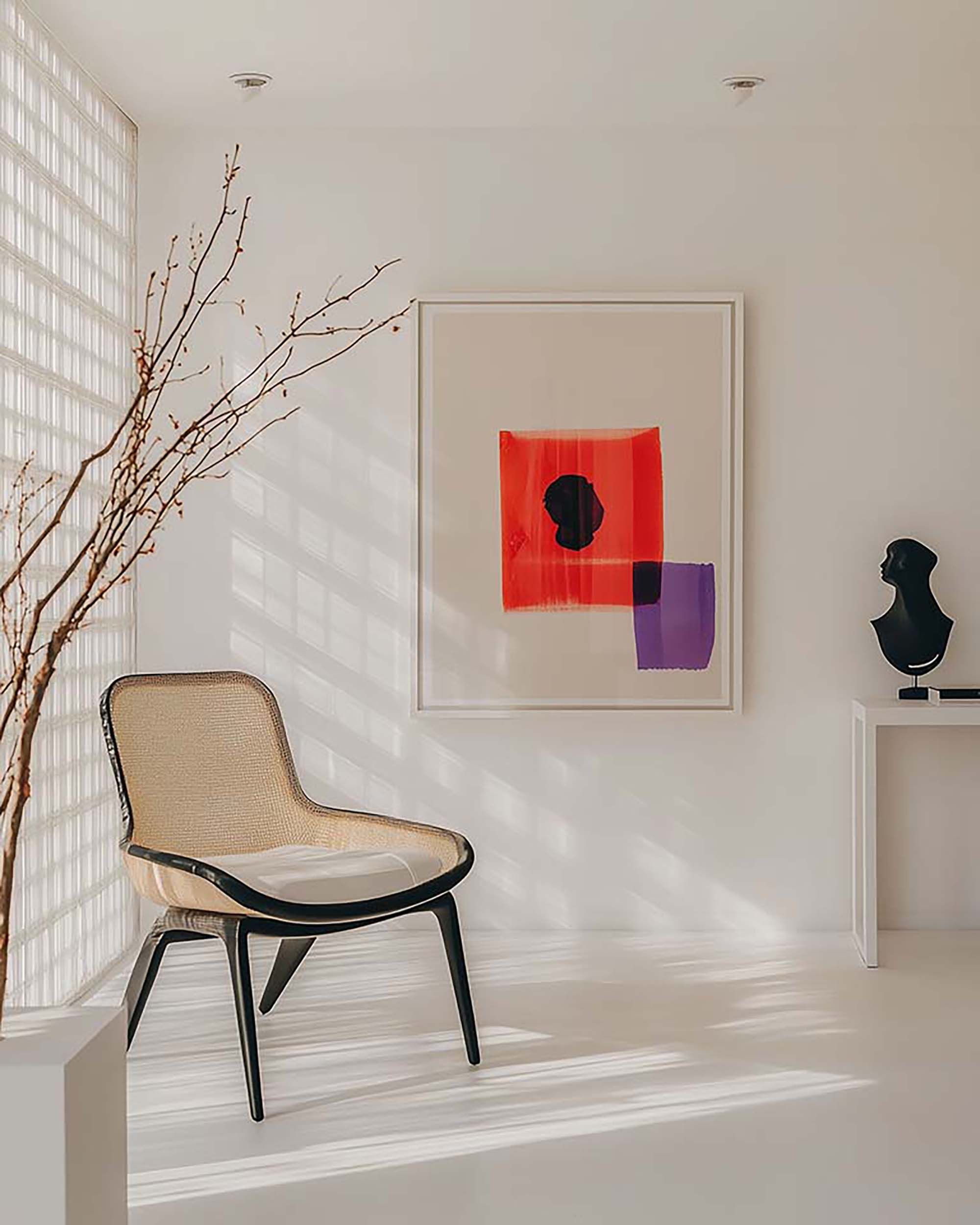Bright minimalist living room corner with a glass block window and a woven accent chair.