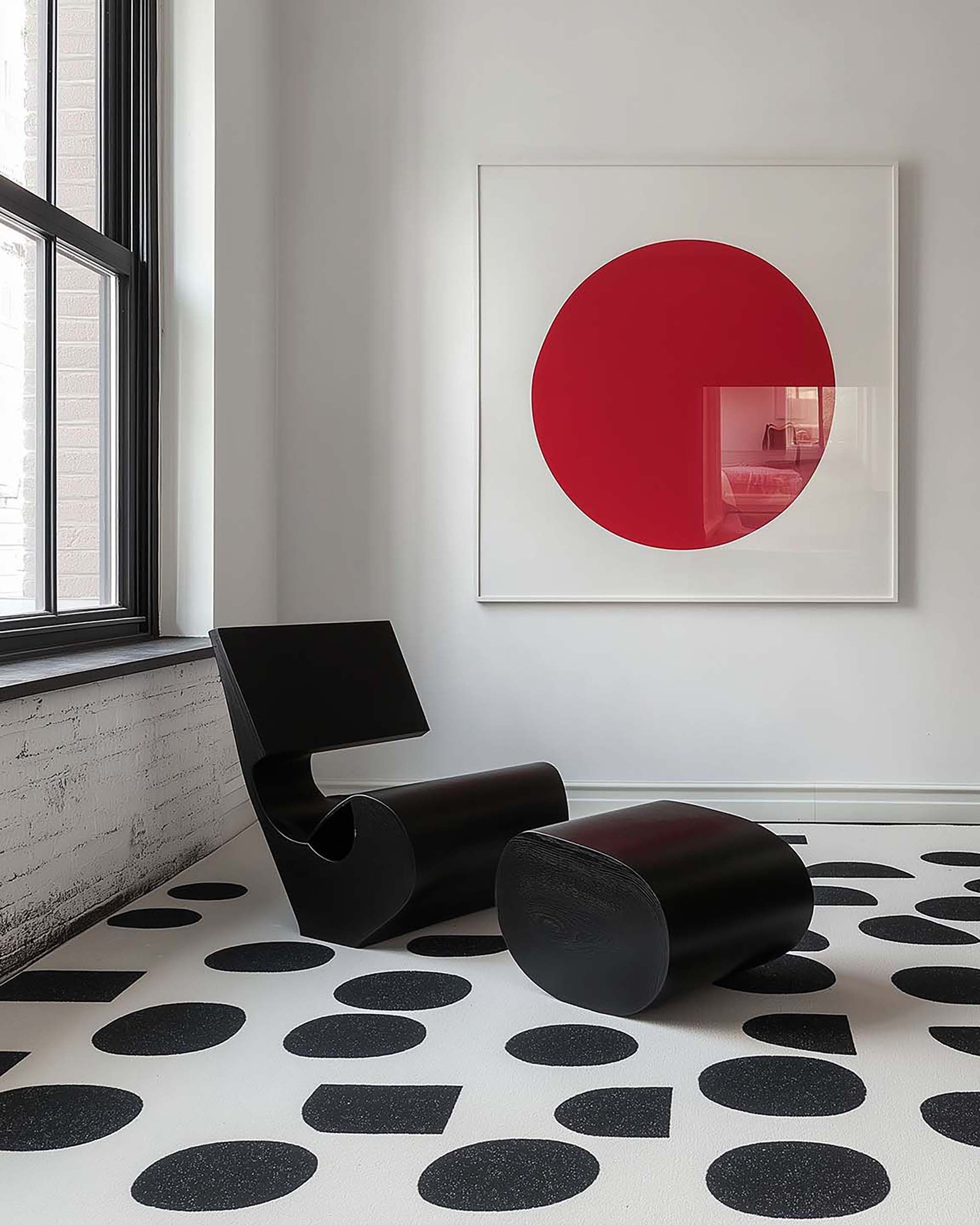Quiet minimalist studio corner with soft daylight, bold floor pattern, and a sculptural chair.