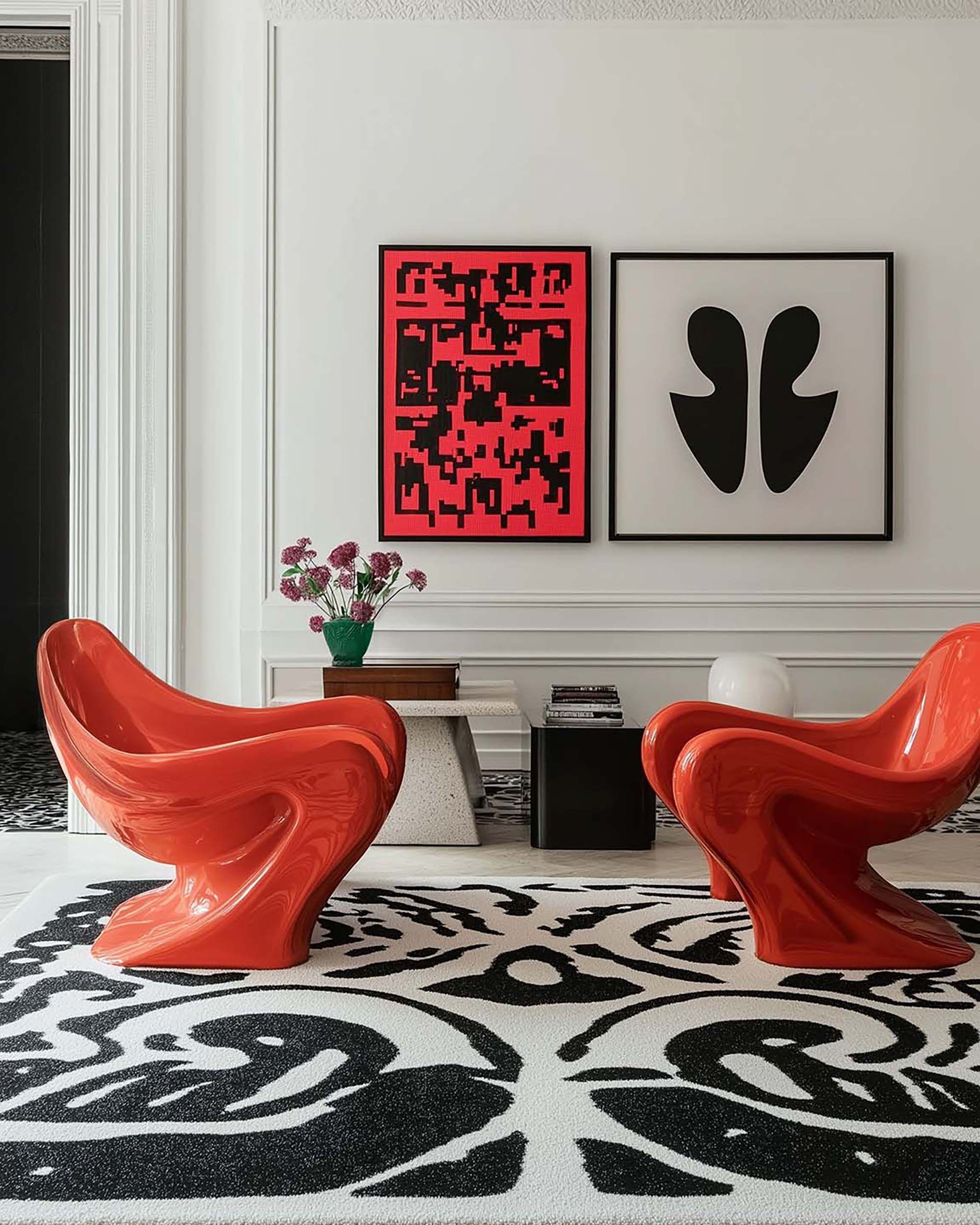 Modern living room with white wall molding, bold red chairs, and a graphic black-and-white rug.