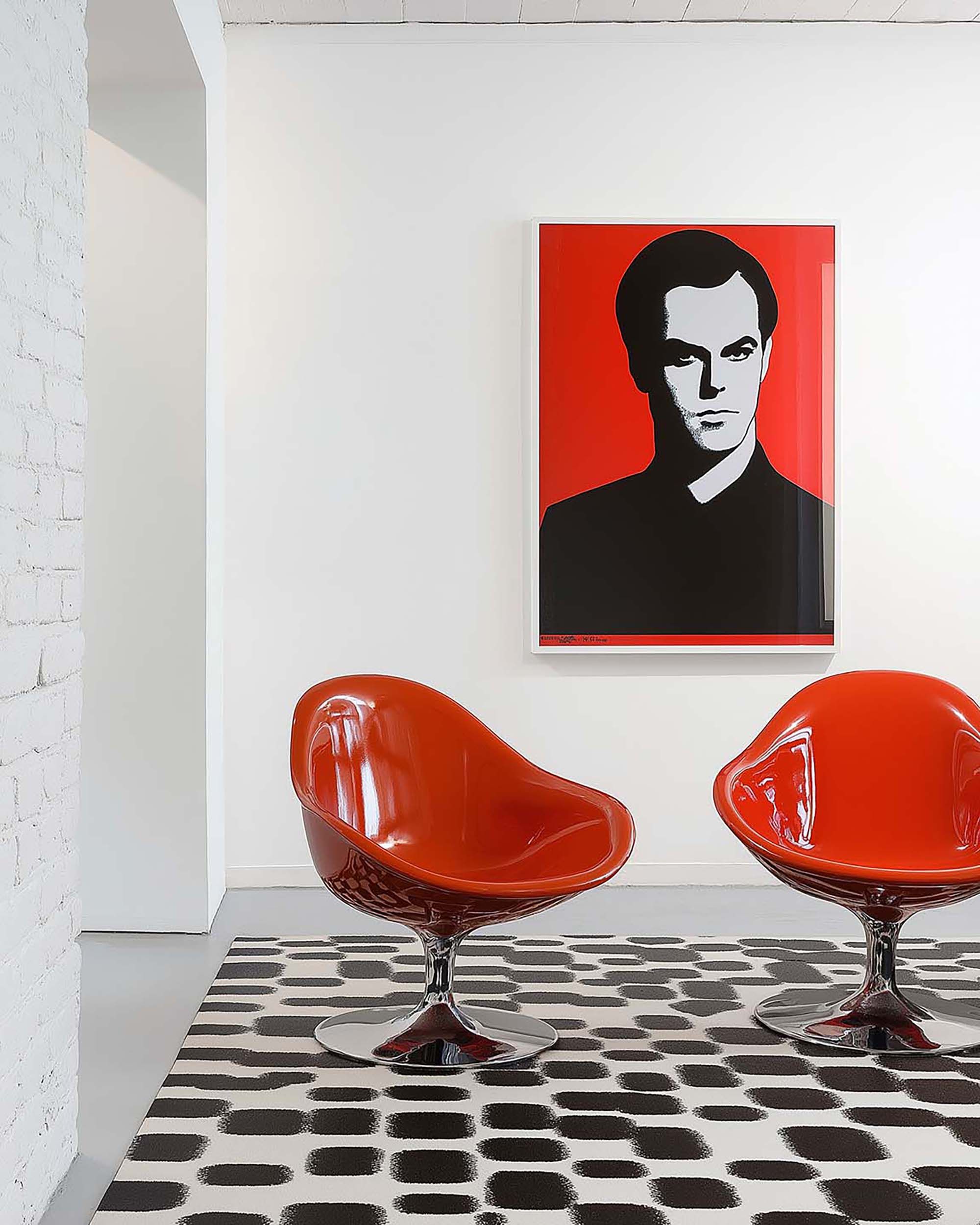 Modern living room nook with two red lounge chairs and a bold black-and-white rug.