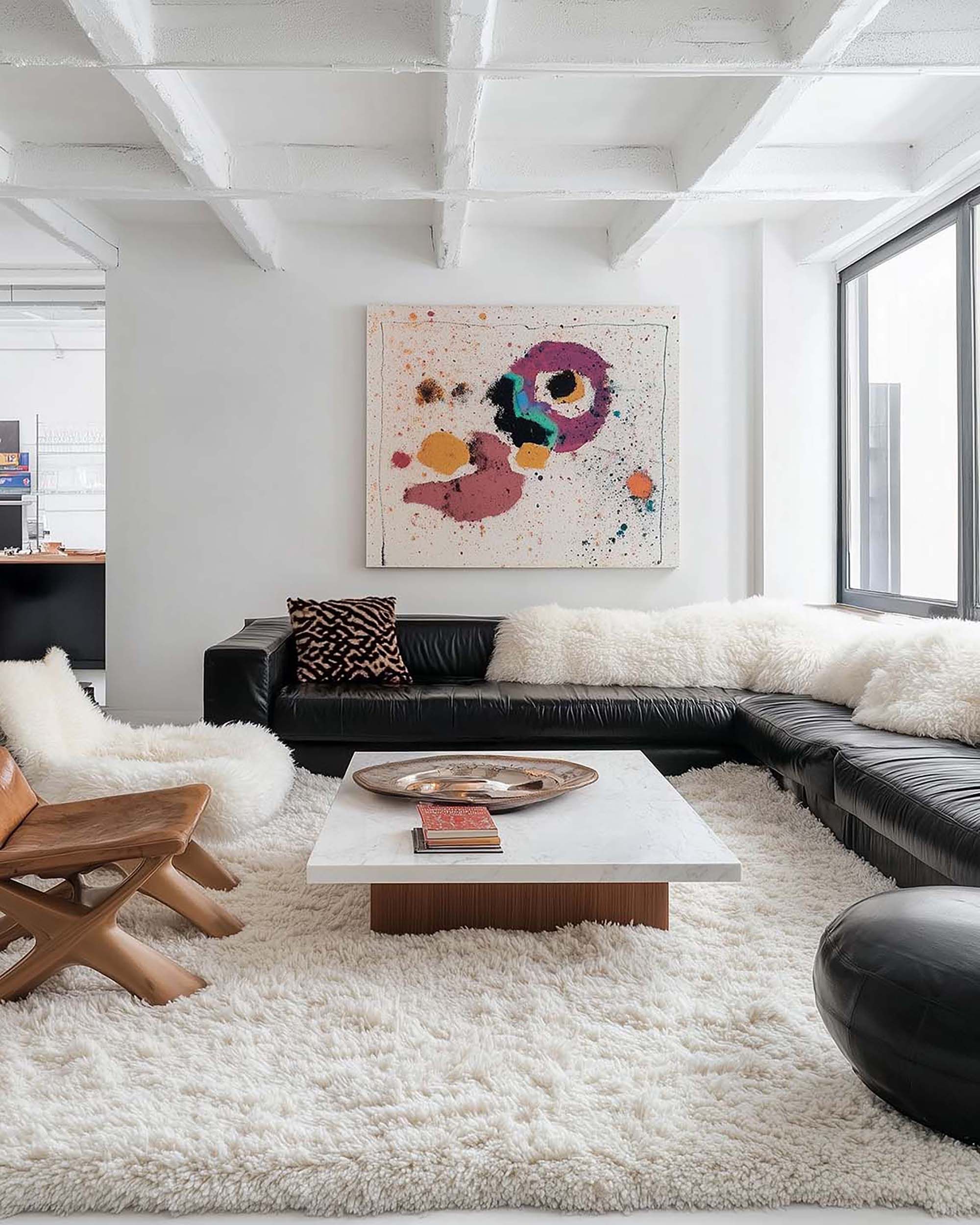 | Features | Open-plan Layout,Large Window,Wall-mounted Frame,Plush Shag Rug,White Beam Ceiling,Bright Natural Light,Low-profile Seating |