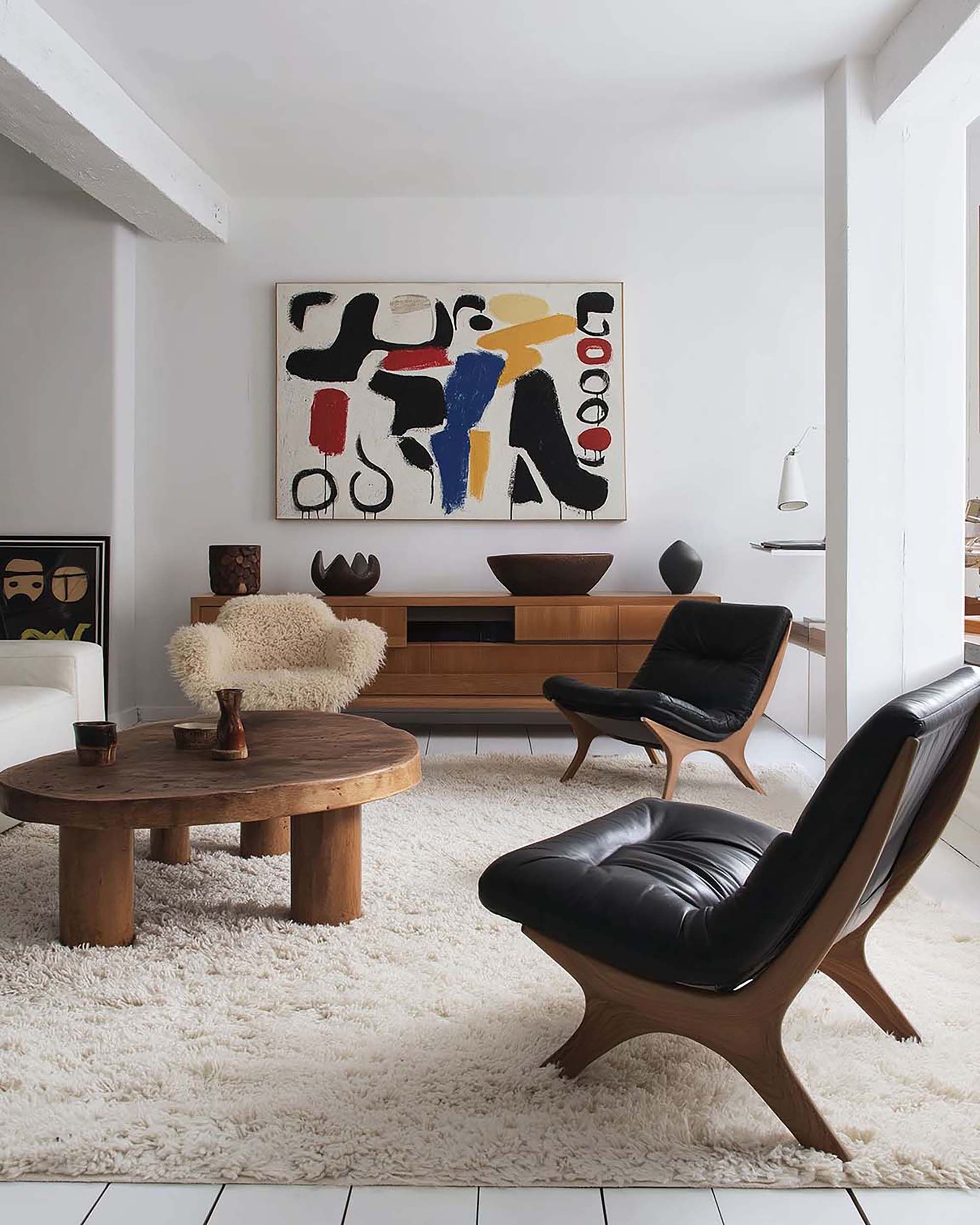 Airy mid-century living room with a low wood sideboard and soft, natural light.
