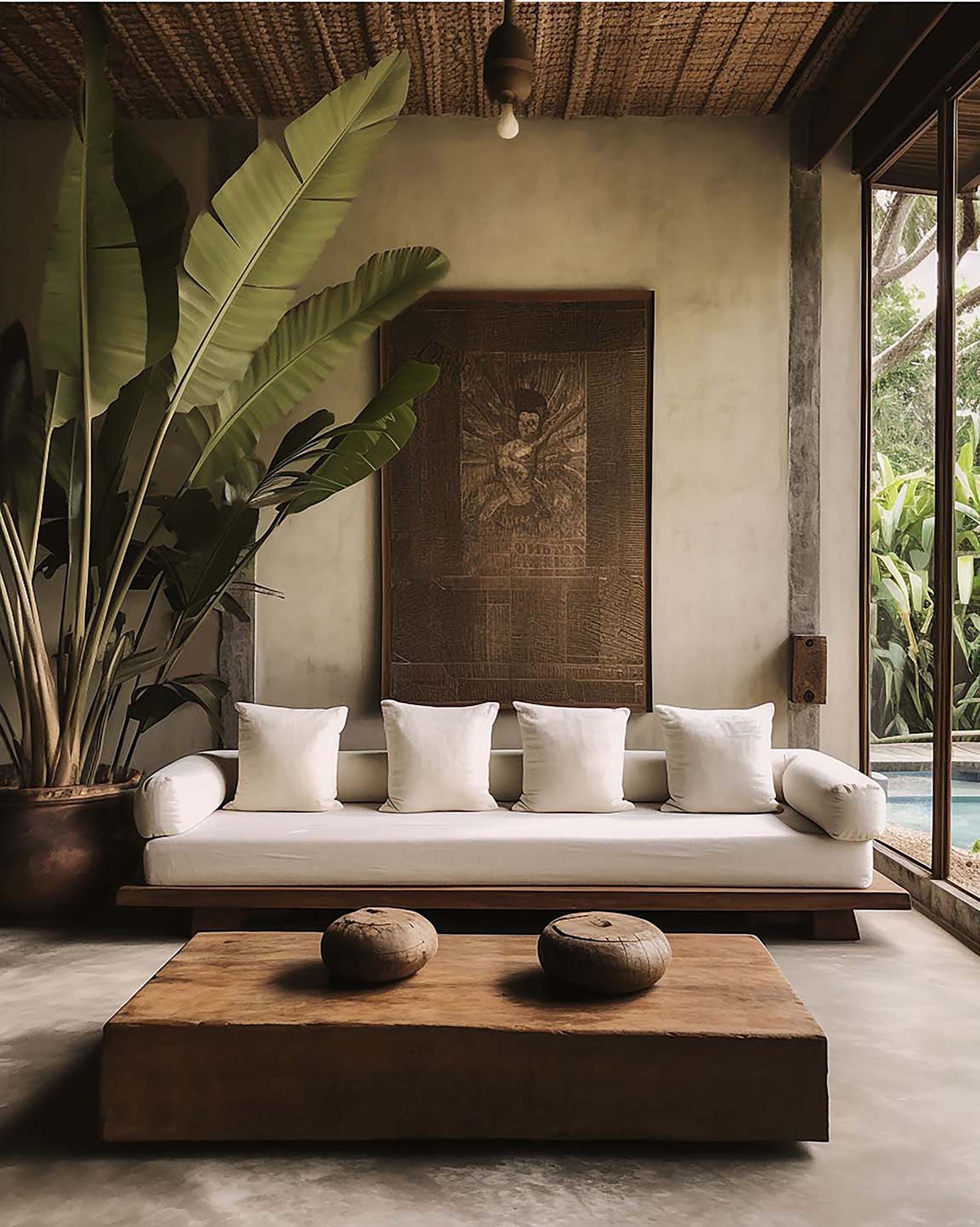Calm tropical-modern living room with plaster walls, warm wood, and soft daylight.